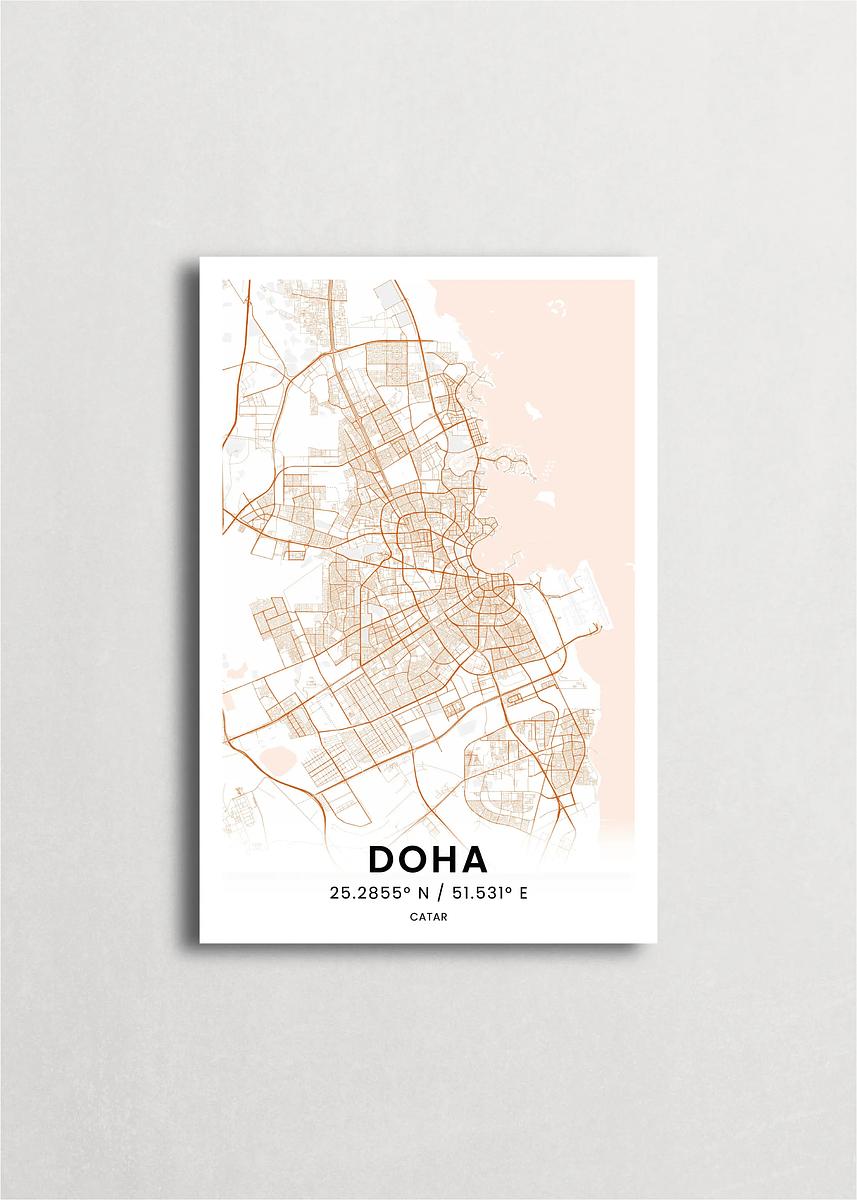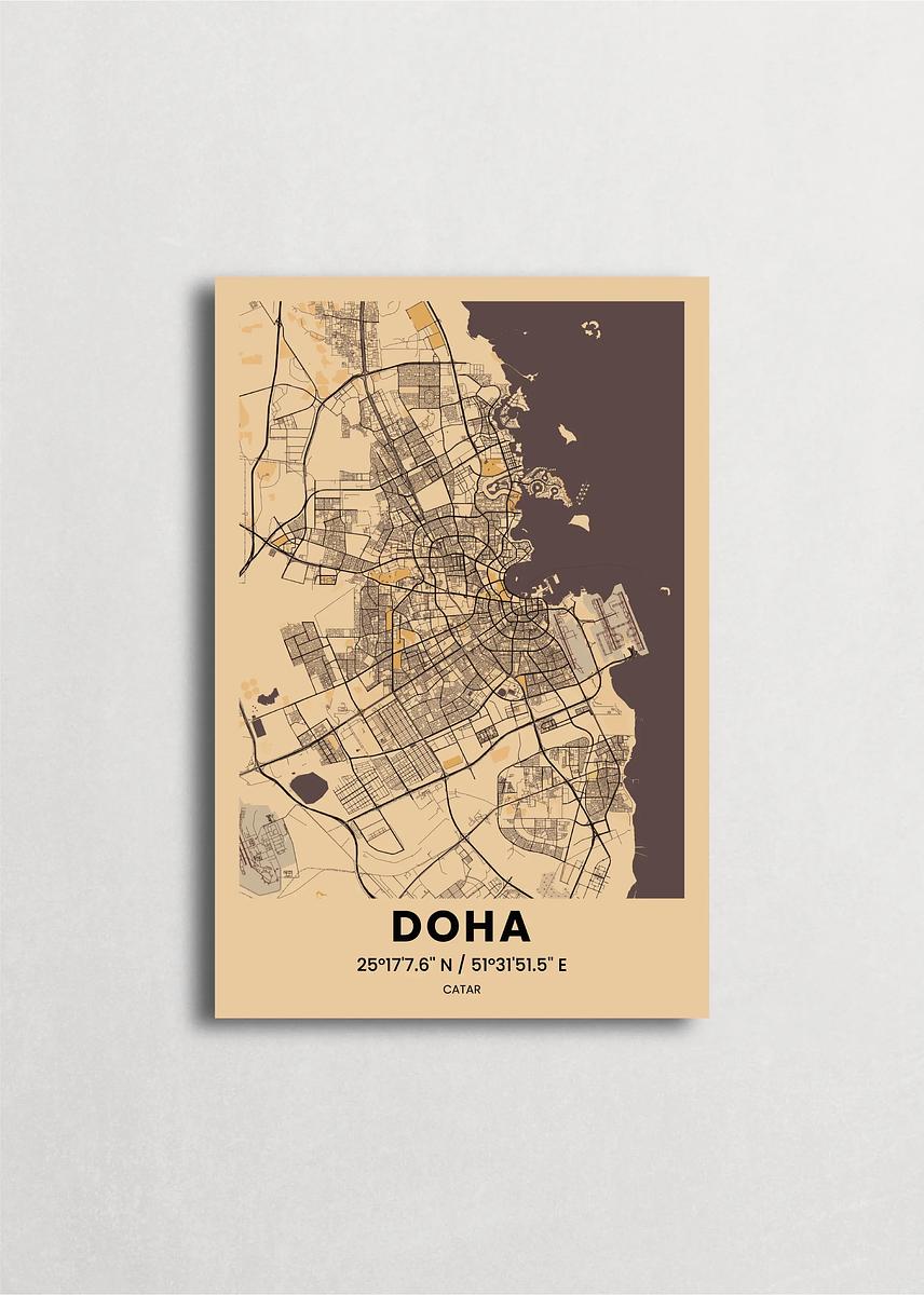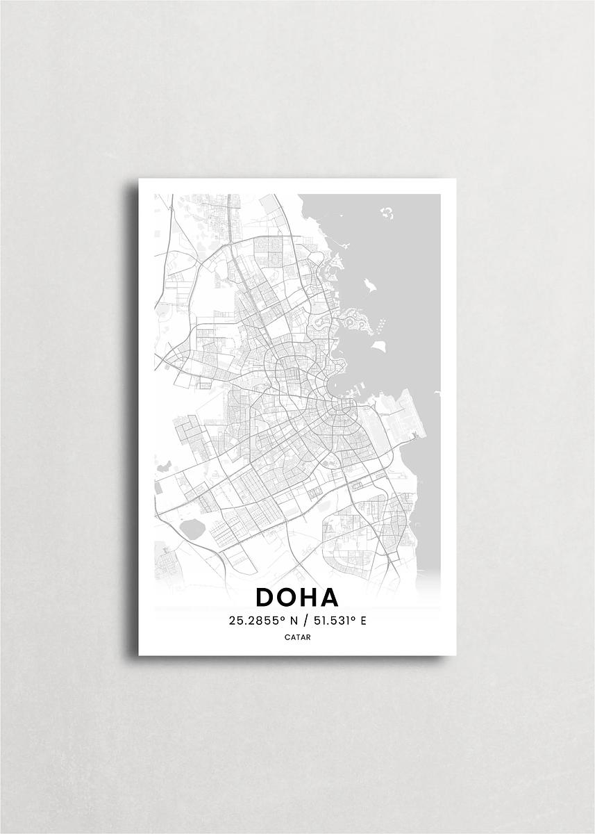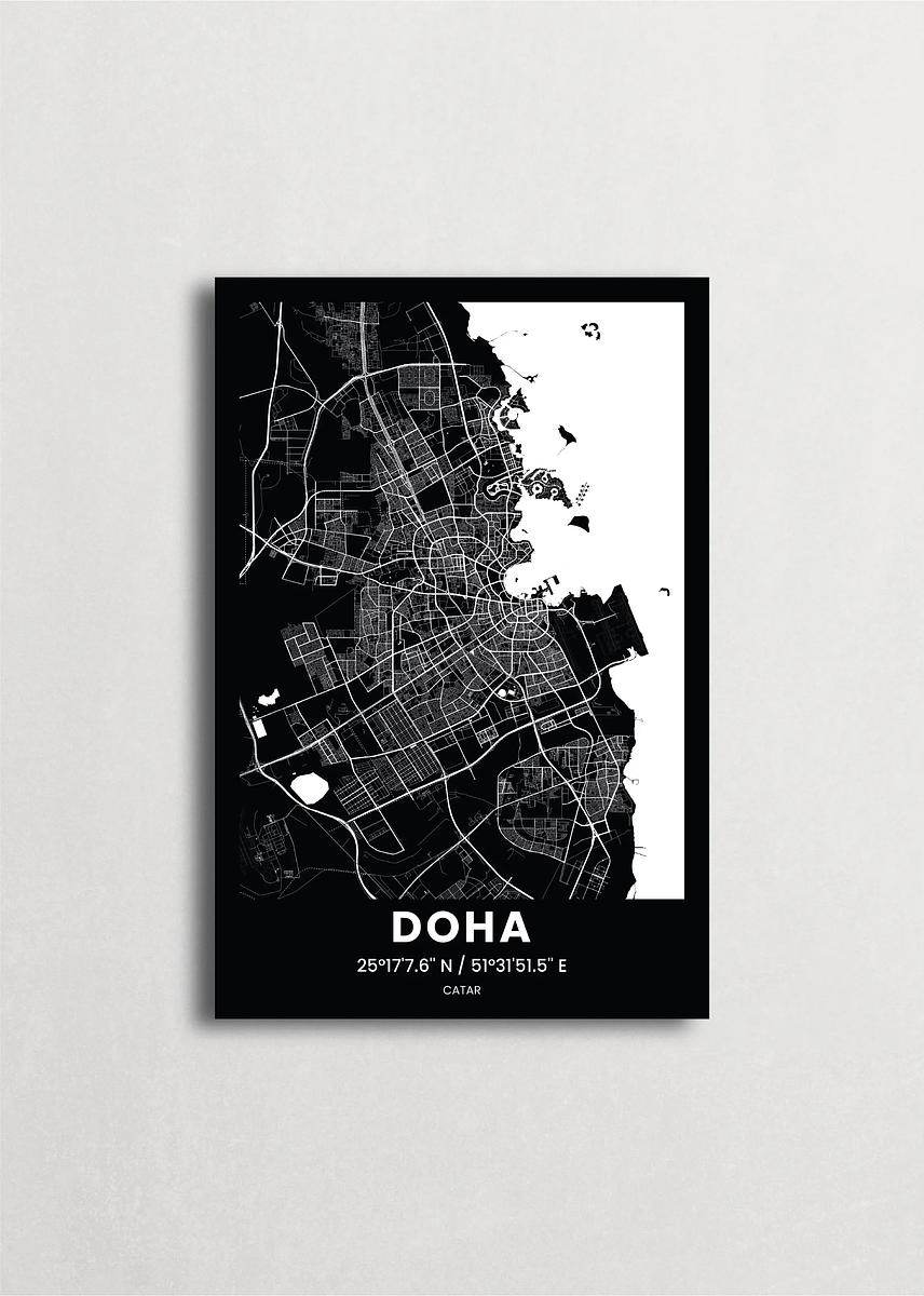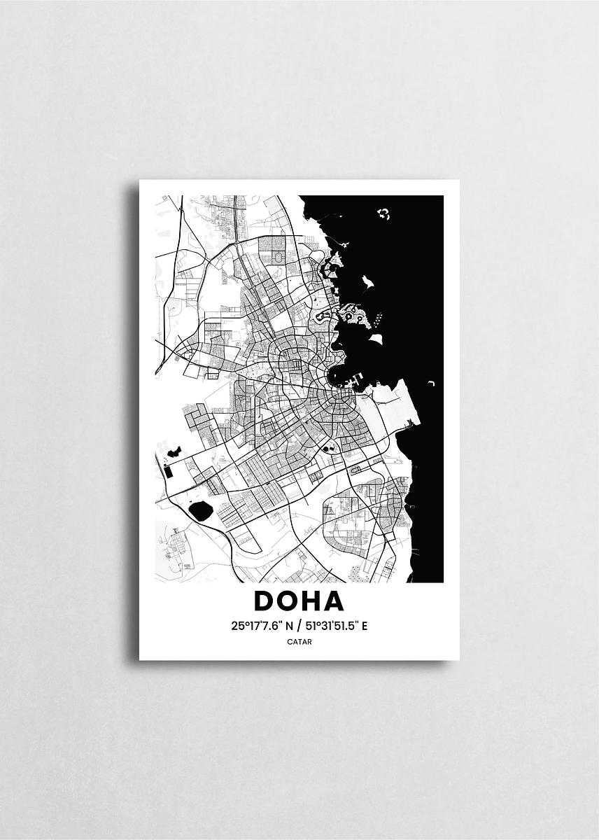Mapa de la ciudad de Doha diseño minimalista que destaca la forma y la estructura de la ciudad. sus colores crean un contraste llamativo que es atemporal y sofisticado.