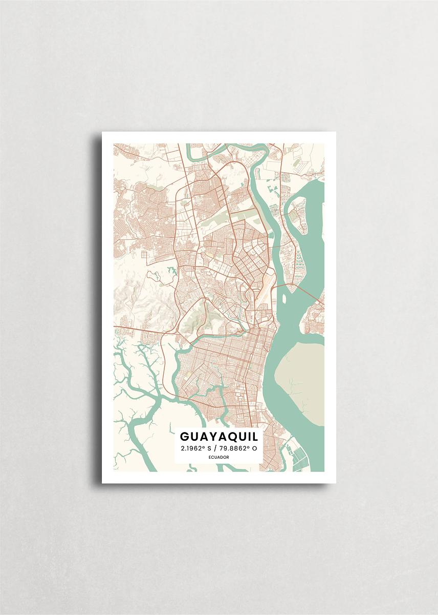 Mapa de la ciudad de Guayaquil diseño minimalista que destaca la forma y la estructura de la ciudad. sus colores crean un contraste llamativo que es atemporal y sofisticado.