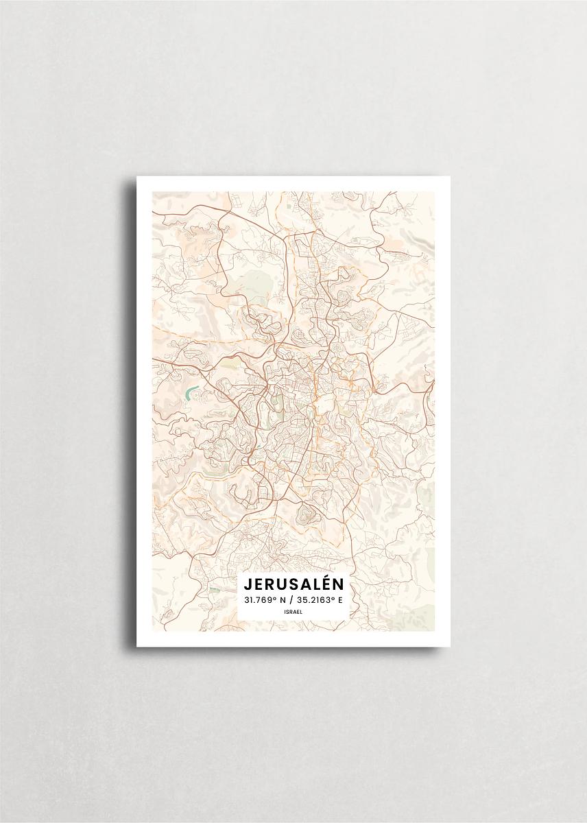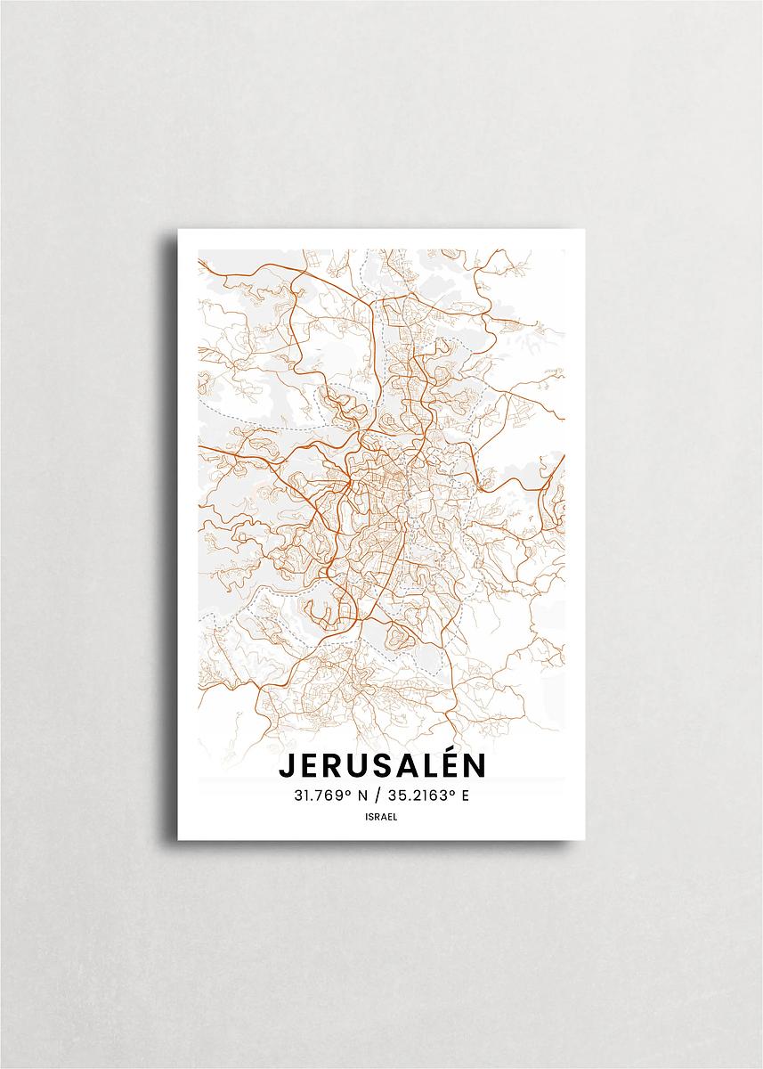 Mapa de la ciudad de Jerusalén diseño minimalista que destaca la forma y la estructura de la ciudad. sus colores crean un contraste llamativo que es atemporal y sofisticado.