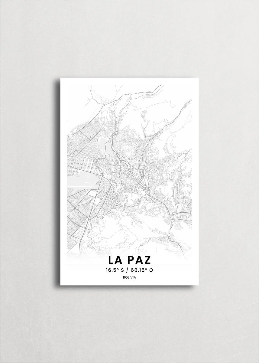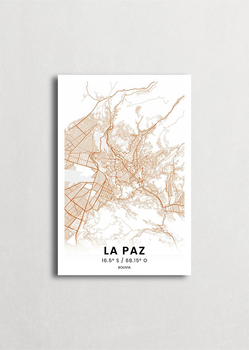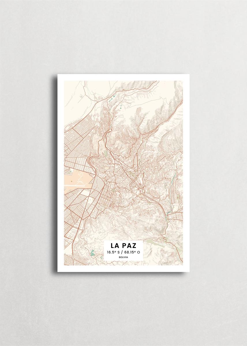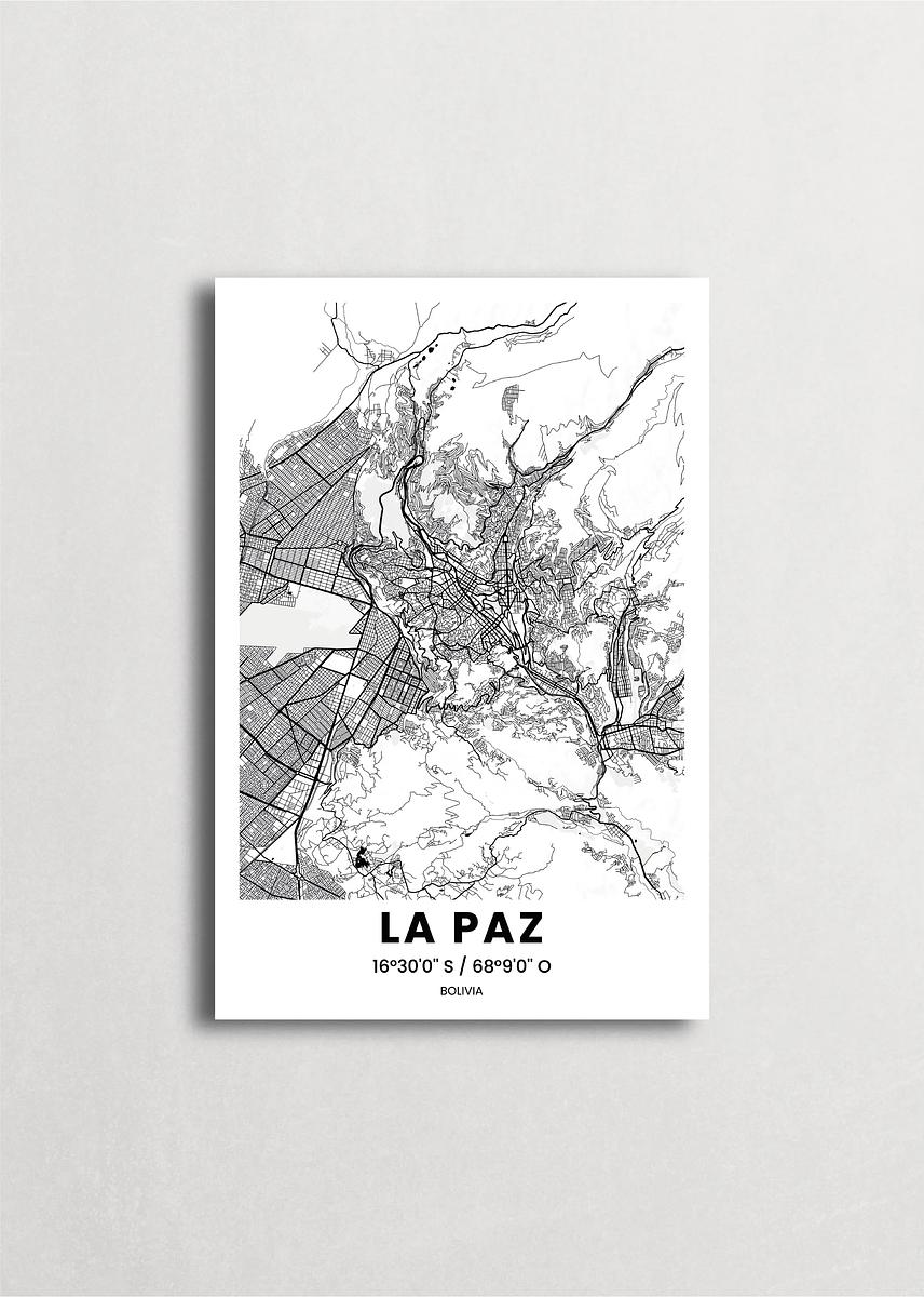 Mapa de la ciudad de La Paz diseño minimalista que destaca la forma y la estructura de la ciudad. sus colores crean un contraste llamativo que es atemporal y sofisticado.