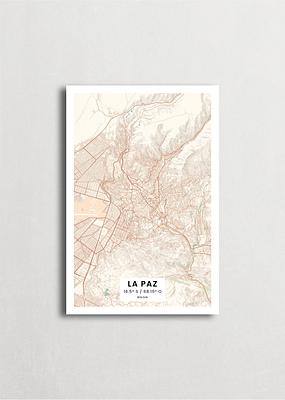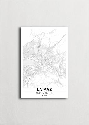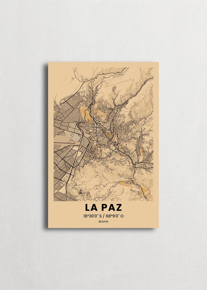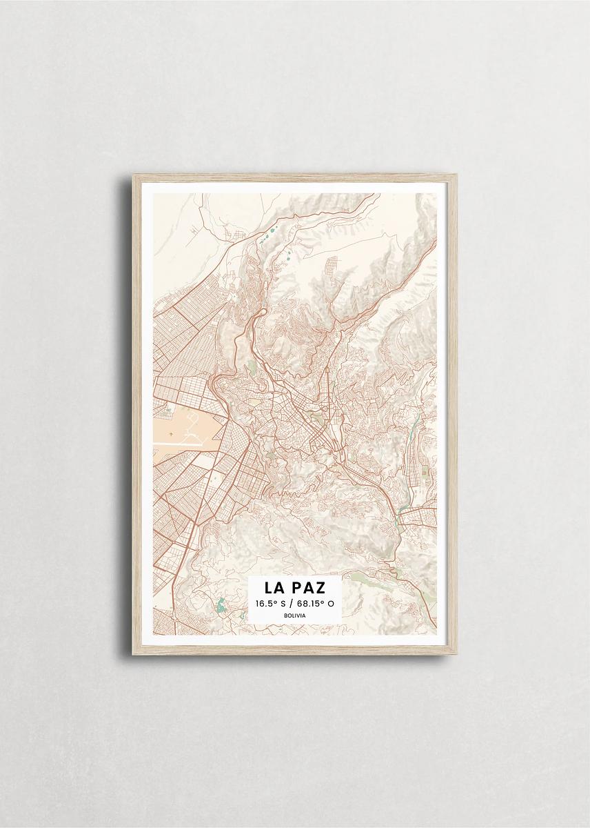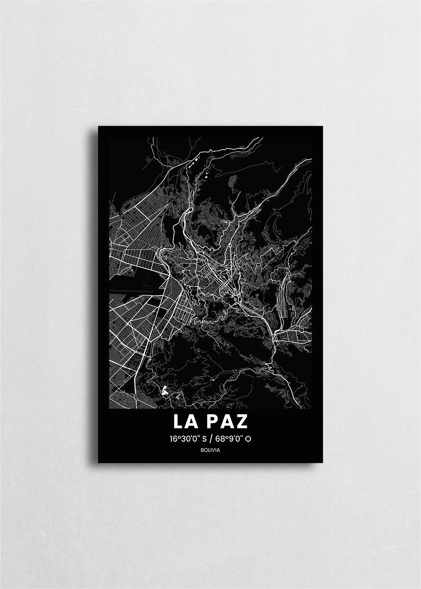 Mapa de la ciudad de La Paz diseño minimalista que destaca la forma y la estructura de la ciudad. sus colores crean un contraste llamativo que es atemporal y sofisticado.
