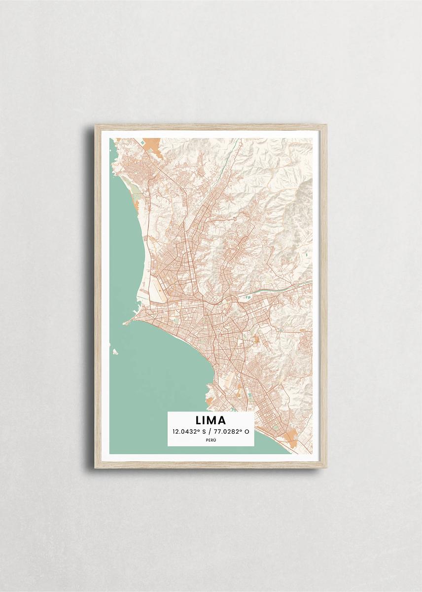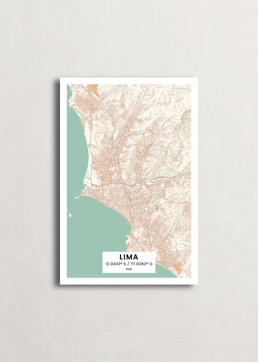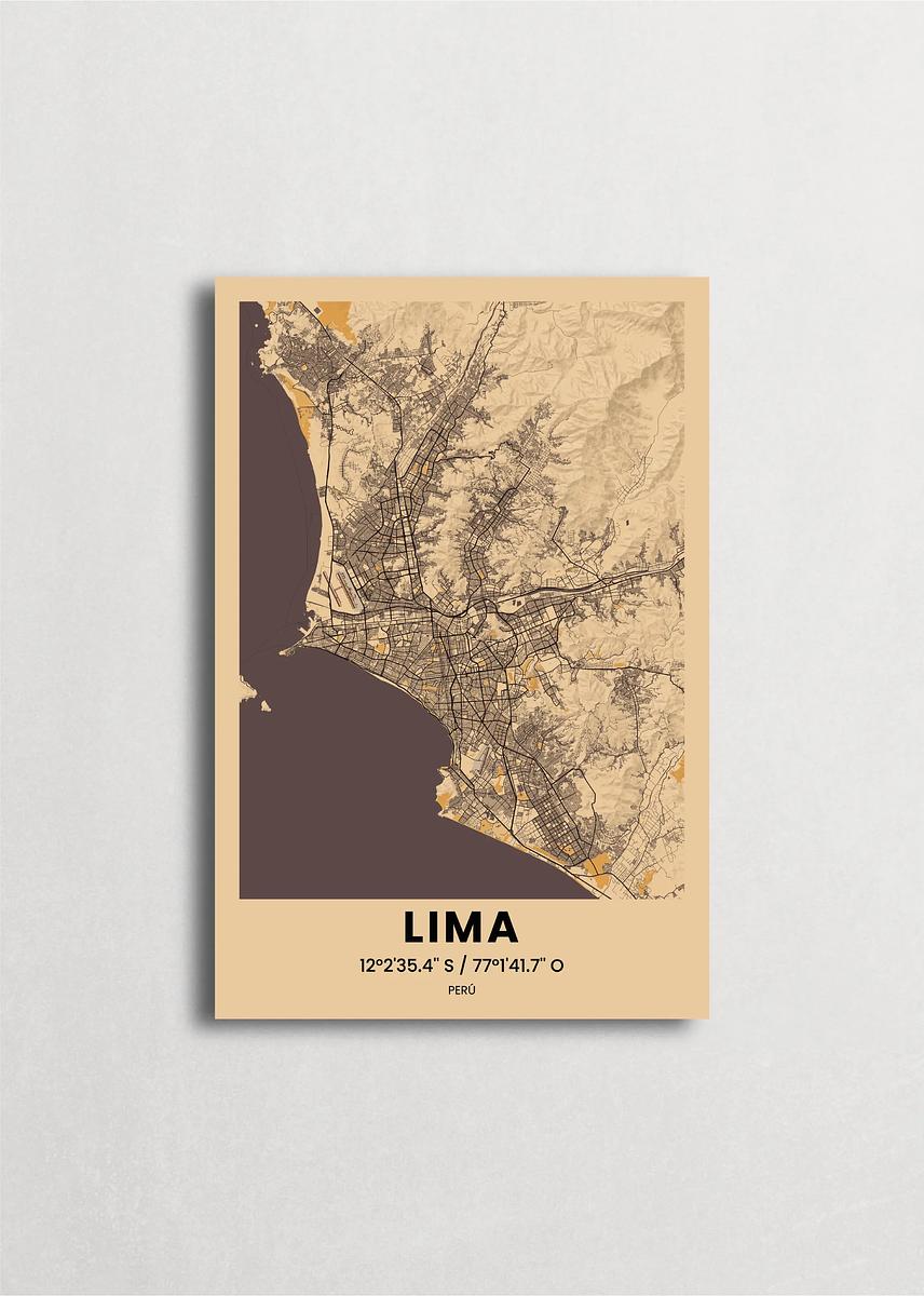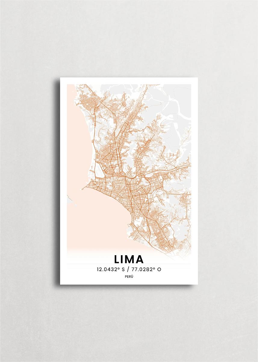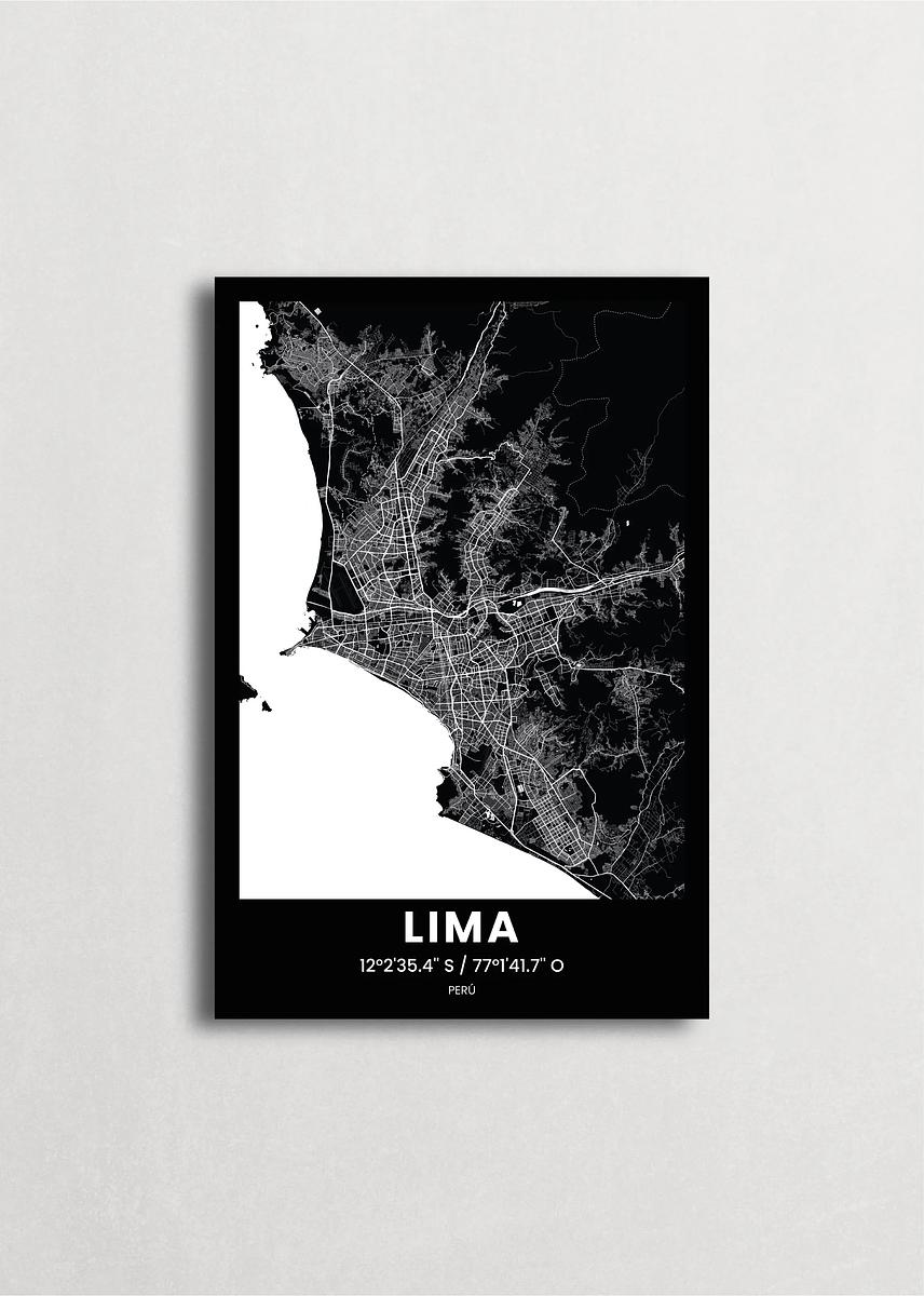 Mapa de la ciudad de Lima diseño minimalista que destaca la forma y la estructura de la ciudad. sus colores crean un contraste llamativo que es atemporal y sofisticado.
