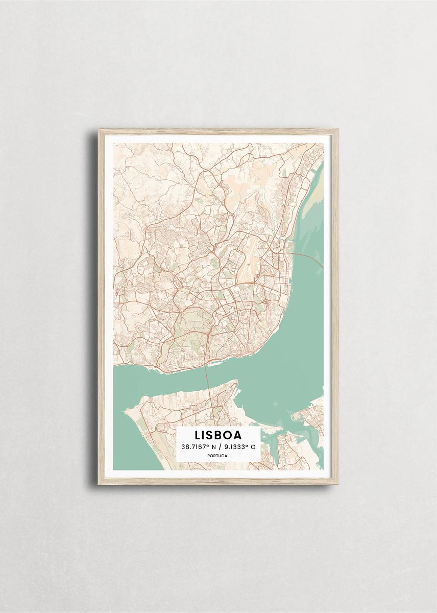 Mapa de la ciudad de Lisboa diseño minimalista que destaca la forma y la estructura de la ciudad. sus colores crean un contraste llamativo que es atemporal y sofisticado.