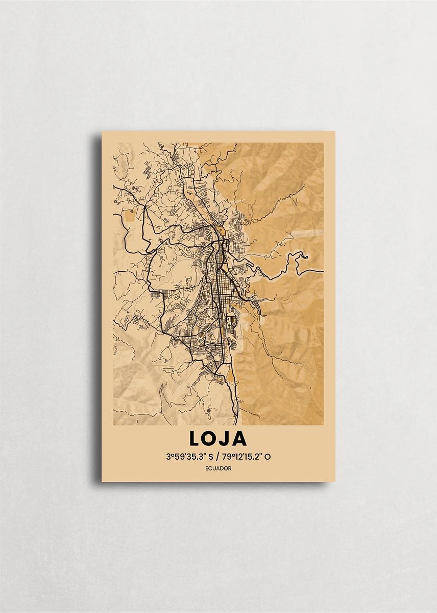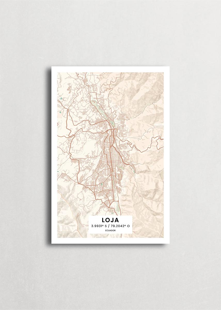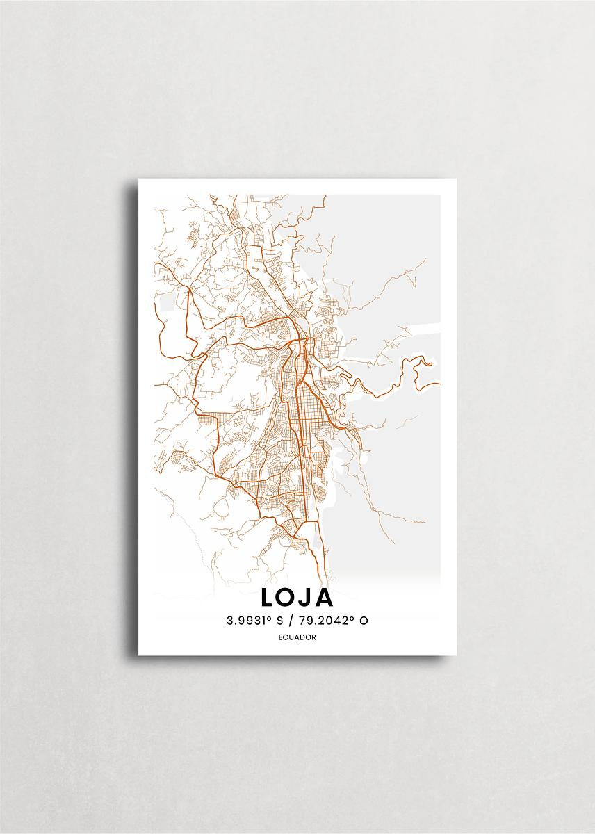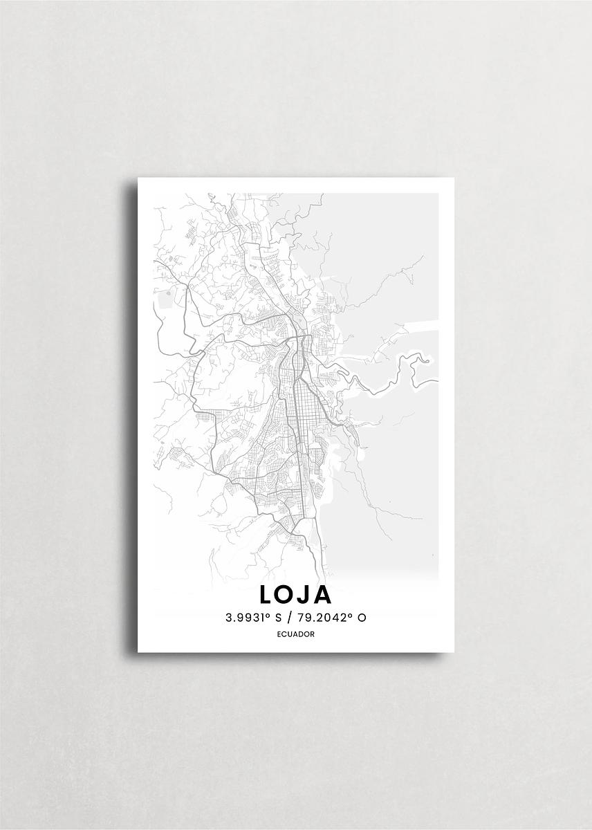 Mapa de la ciudad de Loja diseño minimalista que destaca la forma y la estructura de la ciudad. sus colores crean un contraste llamativo que es atemporal y sofisticado.
