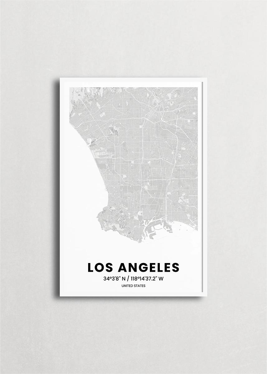 Mapa de la ciudad de Los Angeles diseño minimalista que destaca la forma y la estructura de la ciudad. sus colores crean un contraste llamativo que es atemporal y sofisticado.