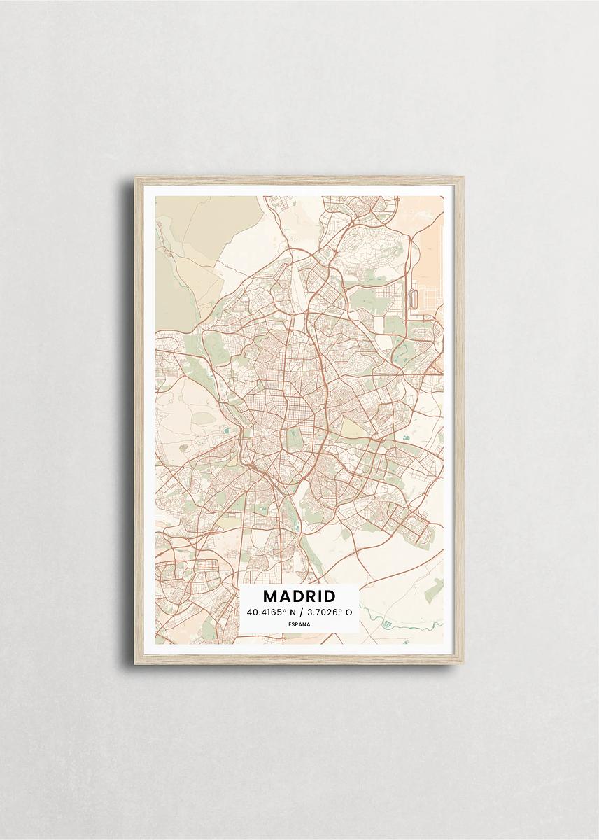 Mapa de la ciudad de Madrid diseño minimalista que destaca la forma y la estructura de la ciudad. sus colores crean un contraste llamativo que es atemporal y sofisticado.