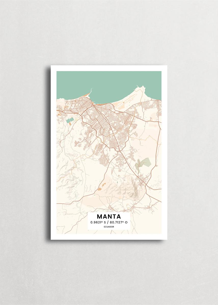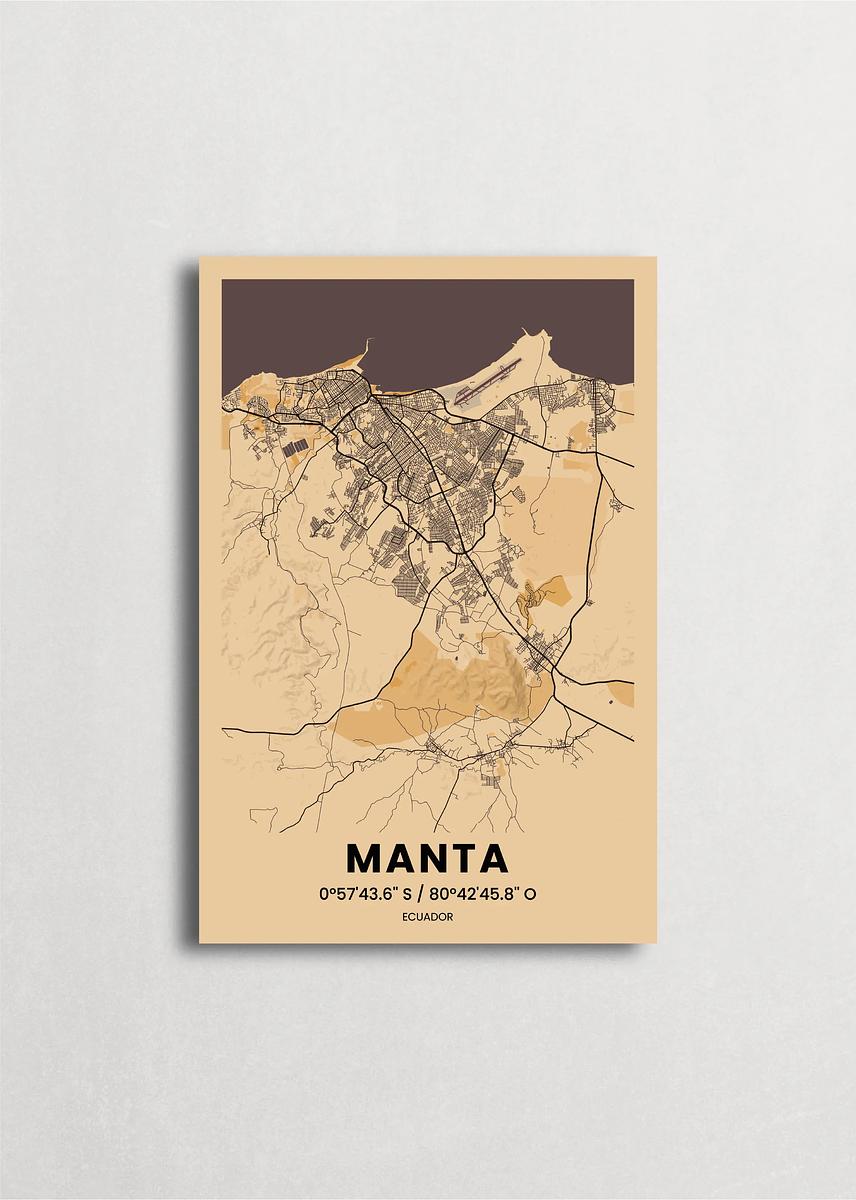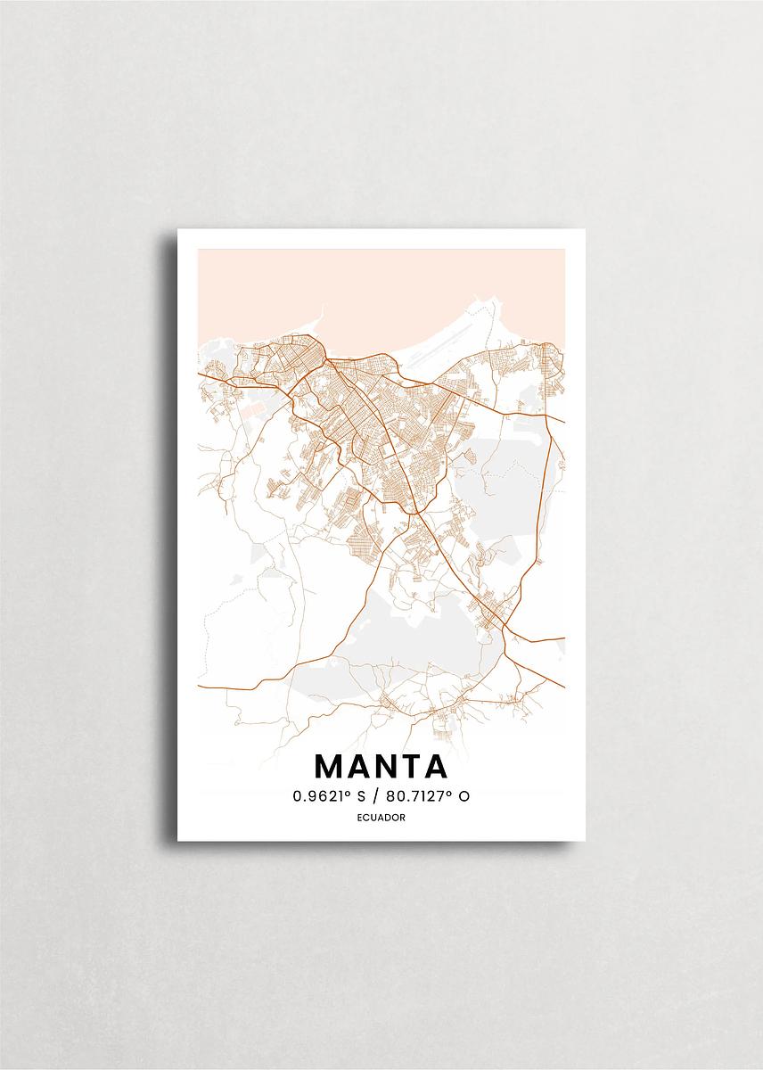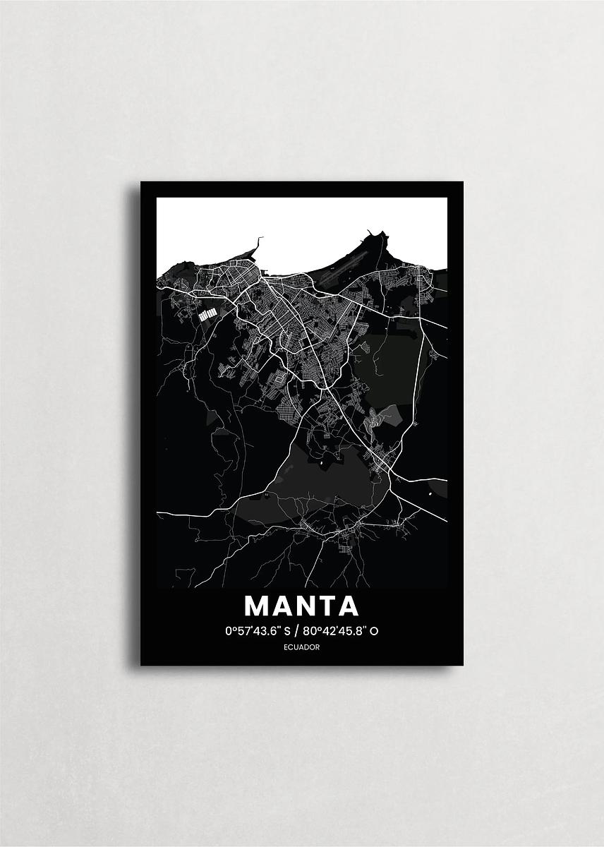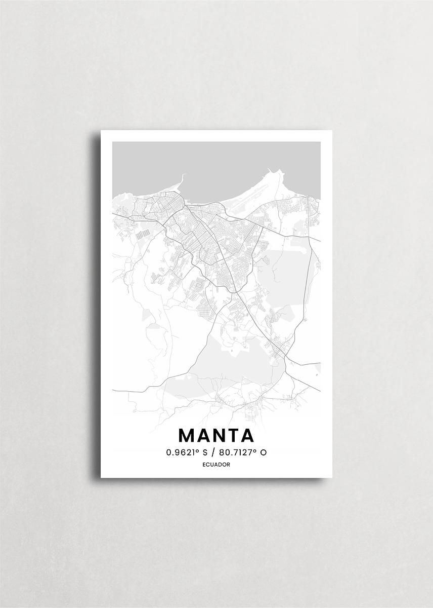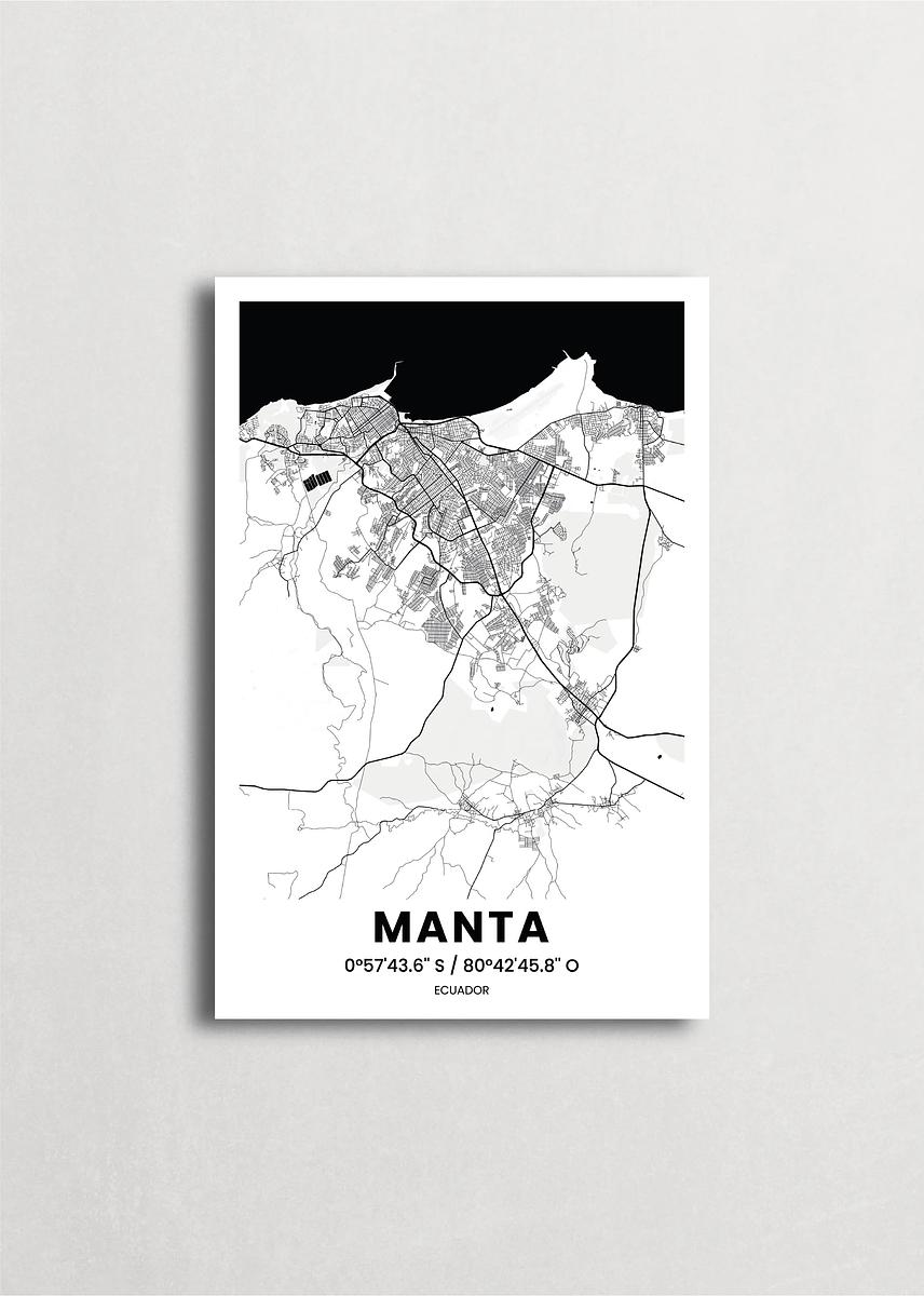 Mapa de la ciudad de Manta diseño minimalista que destaca la forma y la estructura de la ciudad. sus colores crean un contraste llamativo que es atemporal y sofisticado.
