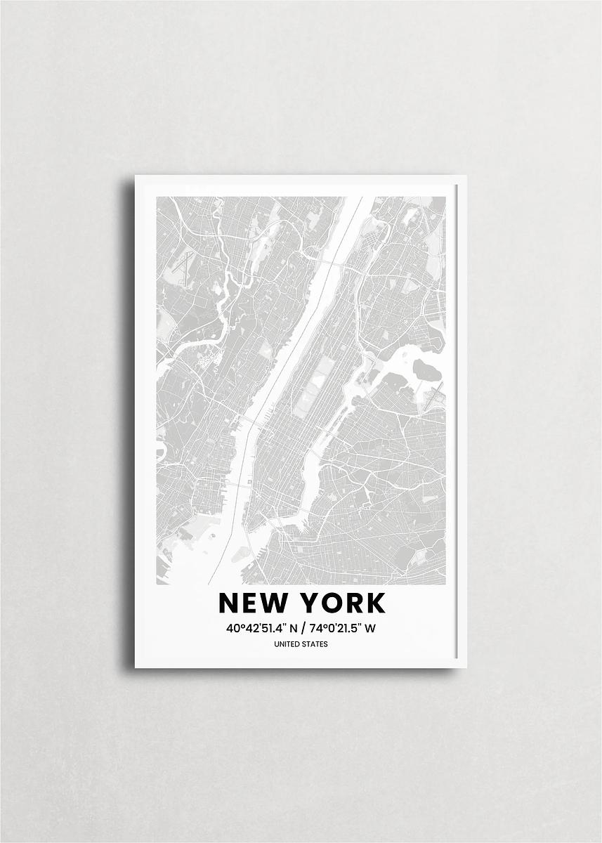 Mapa de la ciudad de Nueva York diseño minimalista que destaca la forma y la estructura de la ciudad. sus colores crean un contraste llamativo que es atemporal y sofisticado.