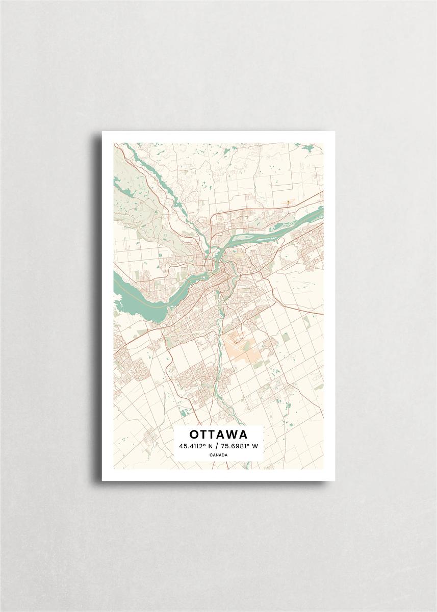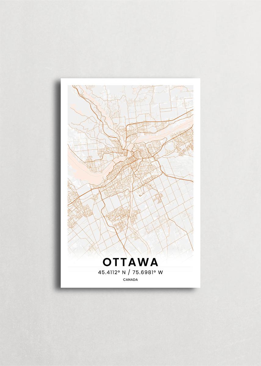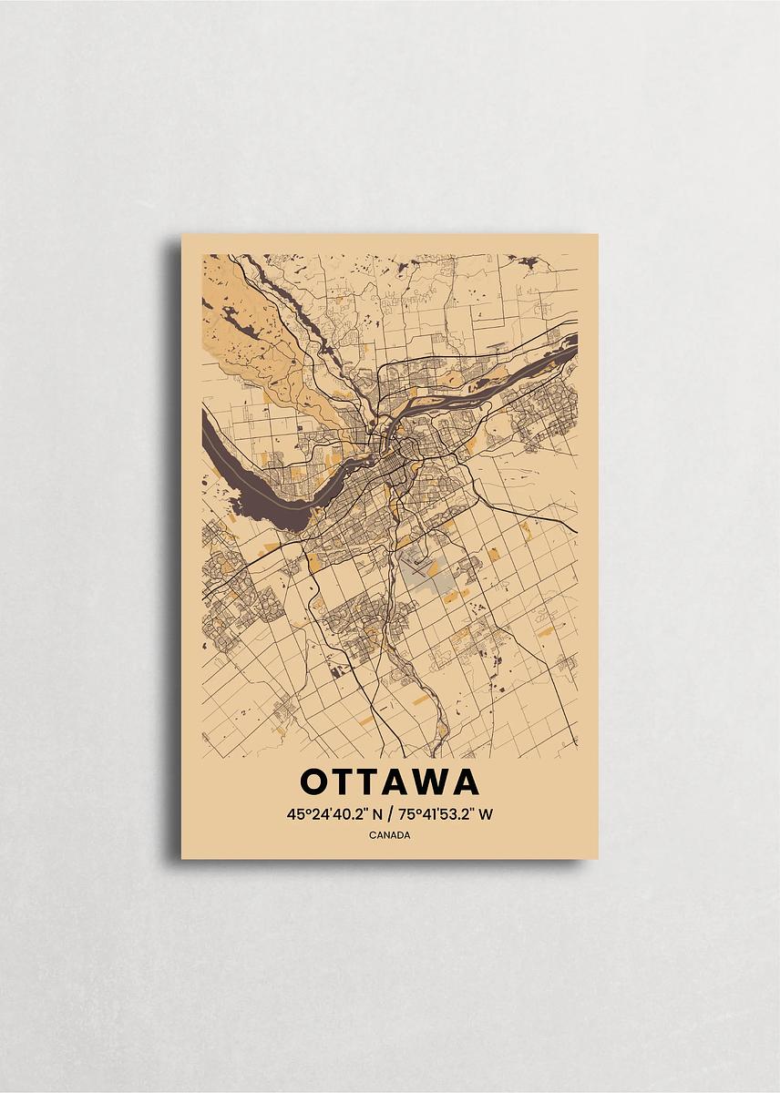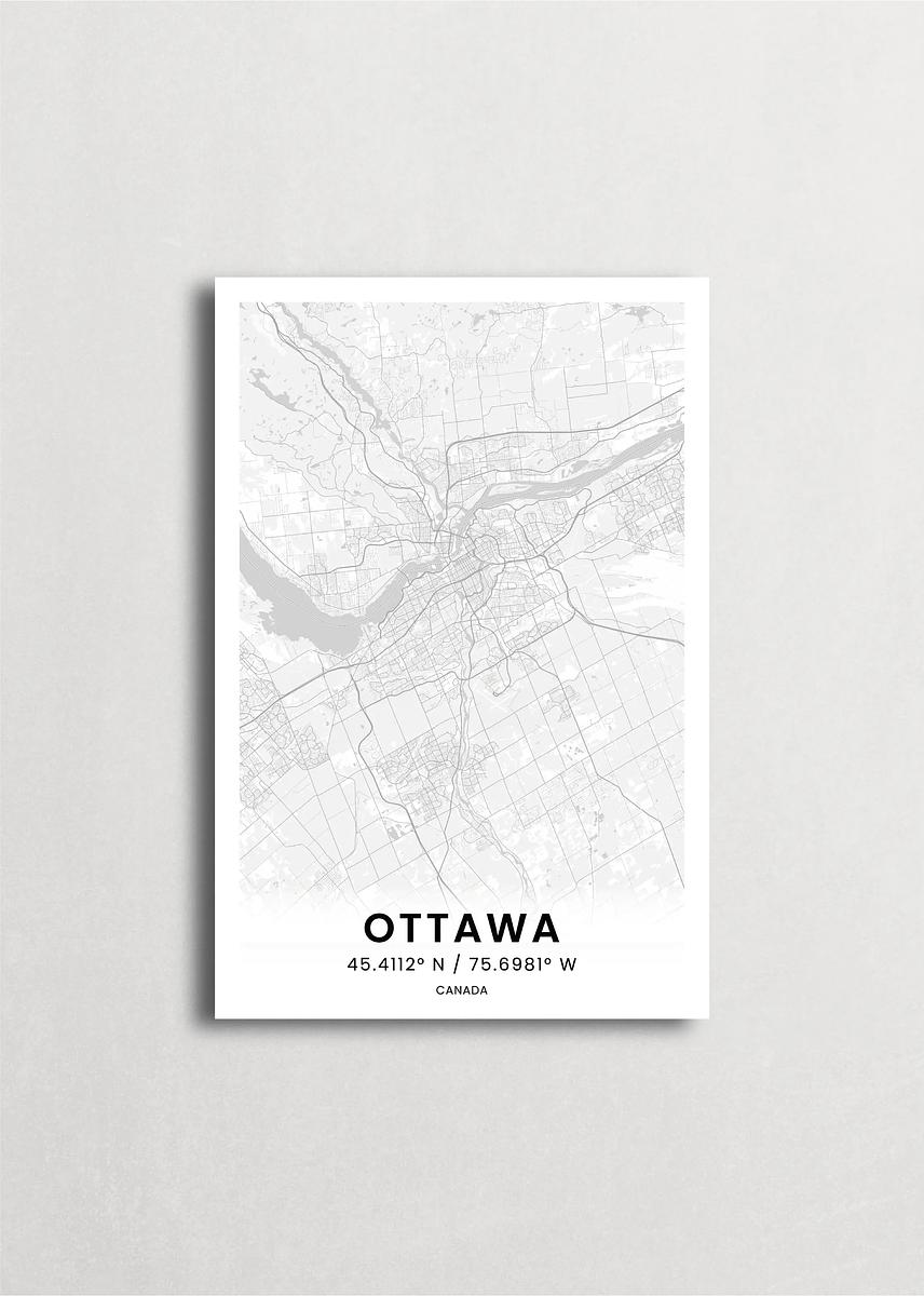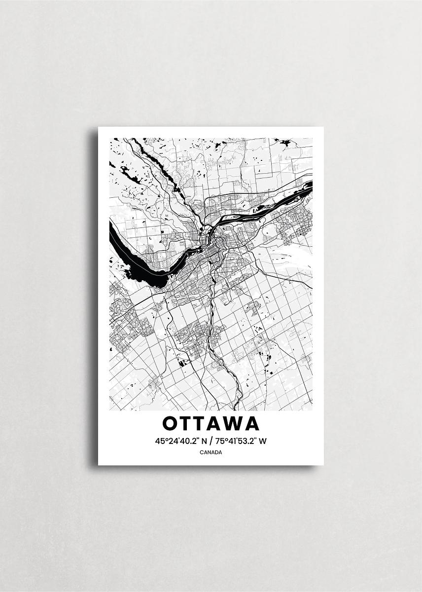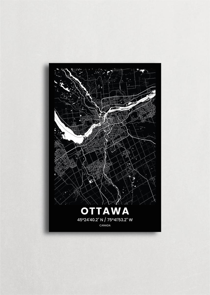 Mapa de la ciudad de Ottawa diseño minimalista que destaca la forma y la estructura de la ciudad. sus colores crean un contraste llamativo que es atemporal y sofisticado.