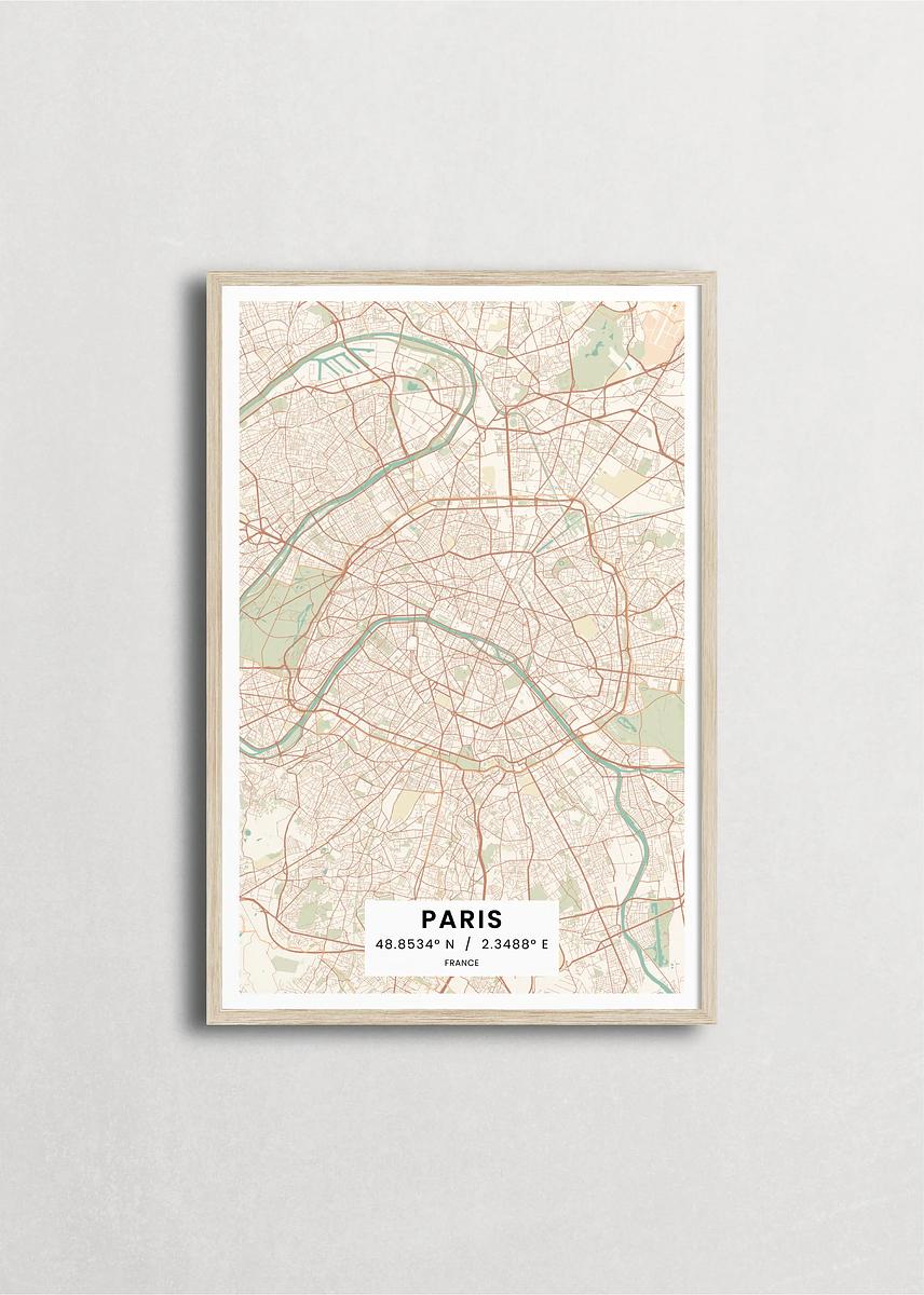 Mapa de la ciudad de París diseño minimalista que destaca la forma y la estructura de la ciudad. sus colores crean un contraste llamativo que es atemporal y sofisticado.