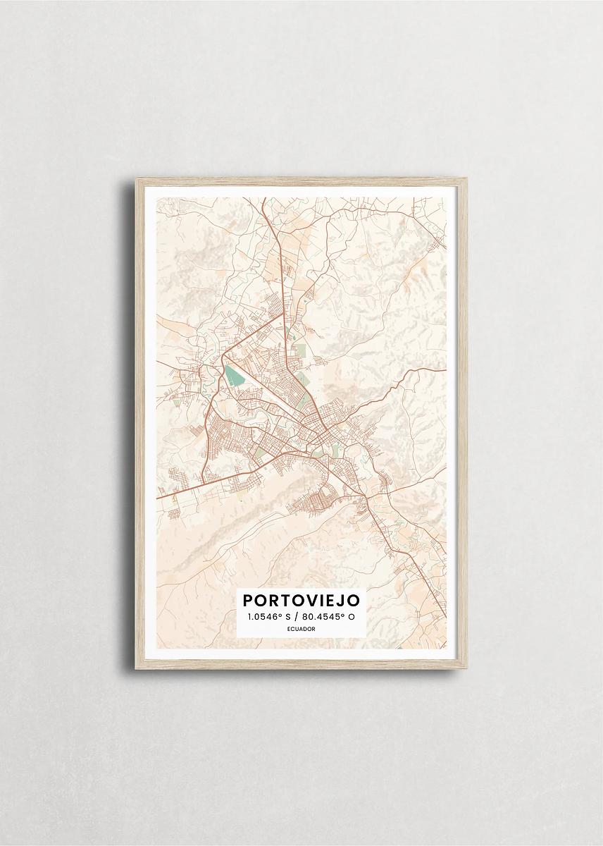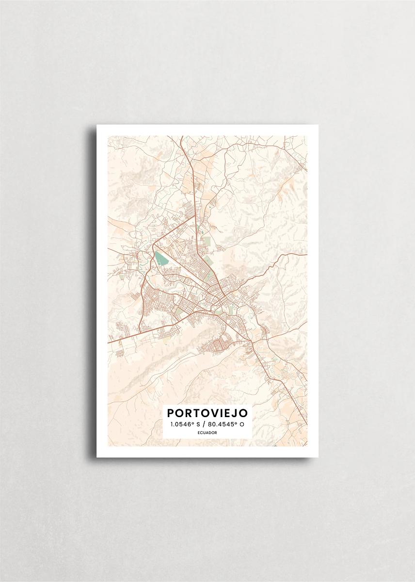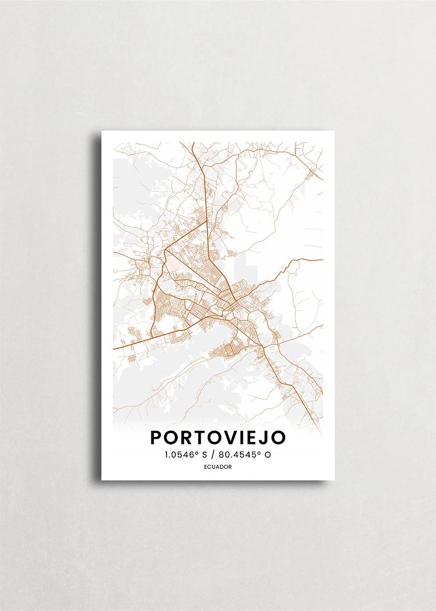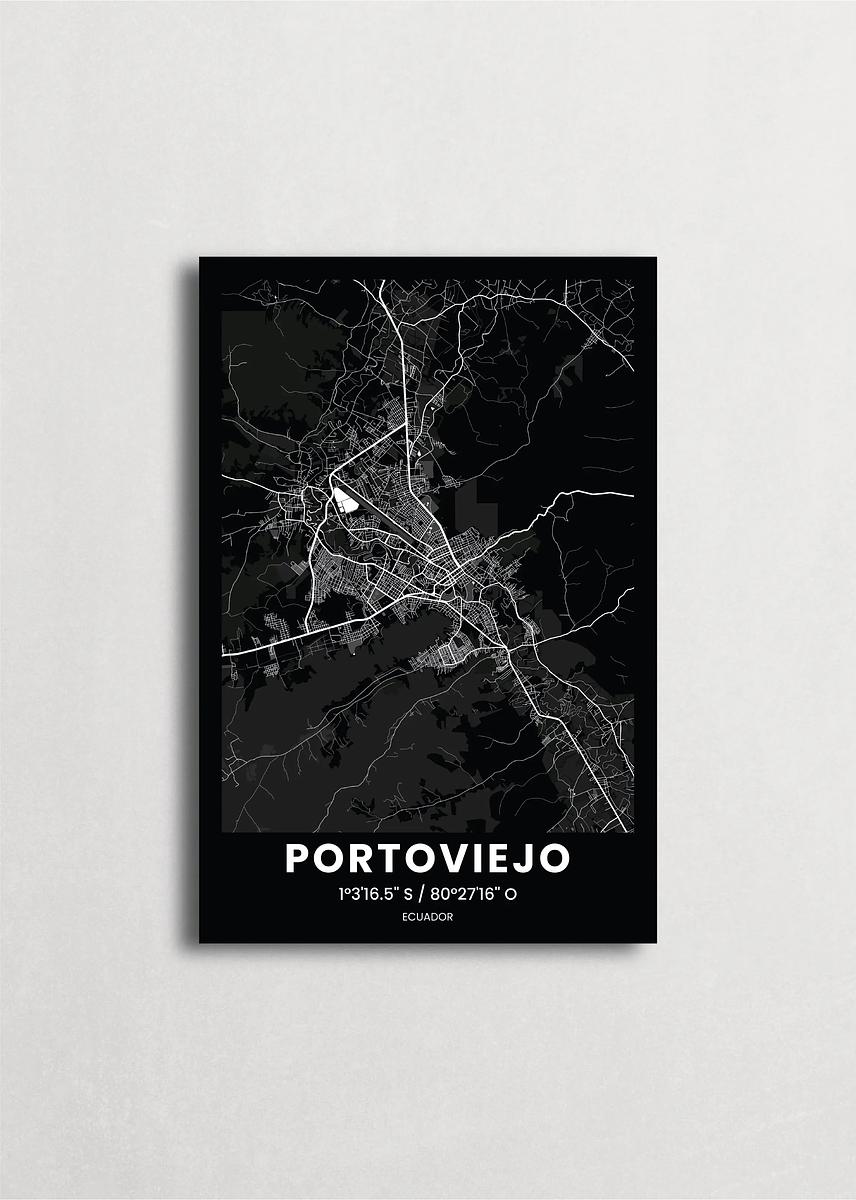 Mapa de la ciudad de Portoviejo diseño minimalista que destaca la forma y la estructura de la ciudad. sus colores crean un contraste llamativo que es atemporal y sofisticado.