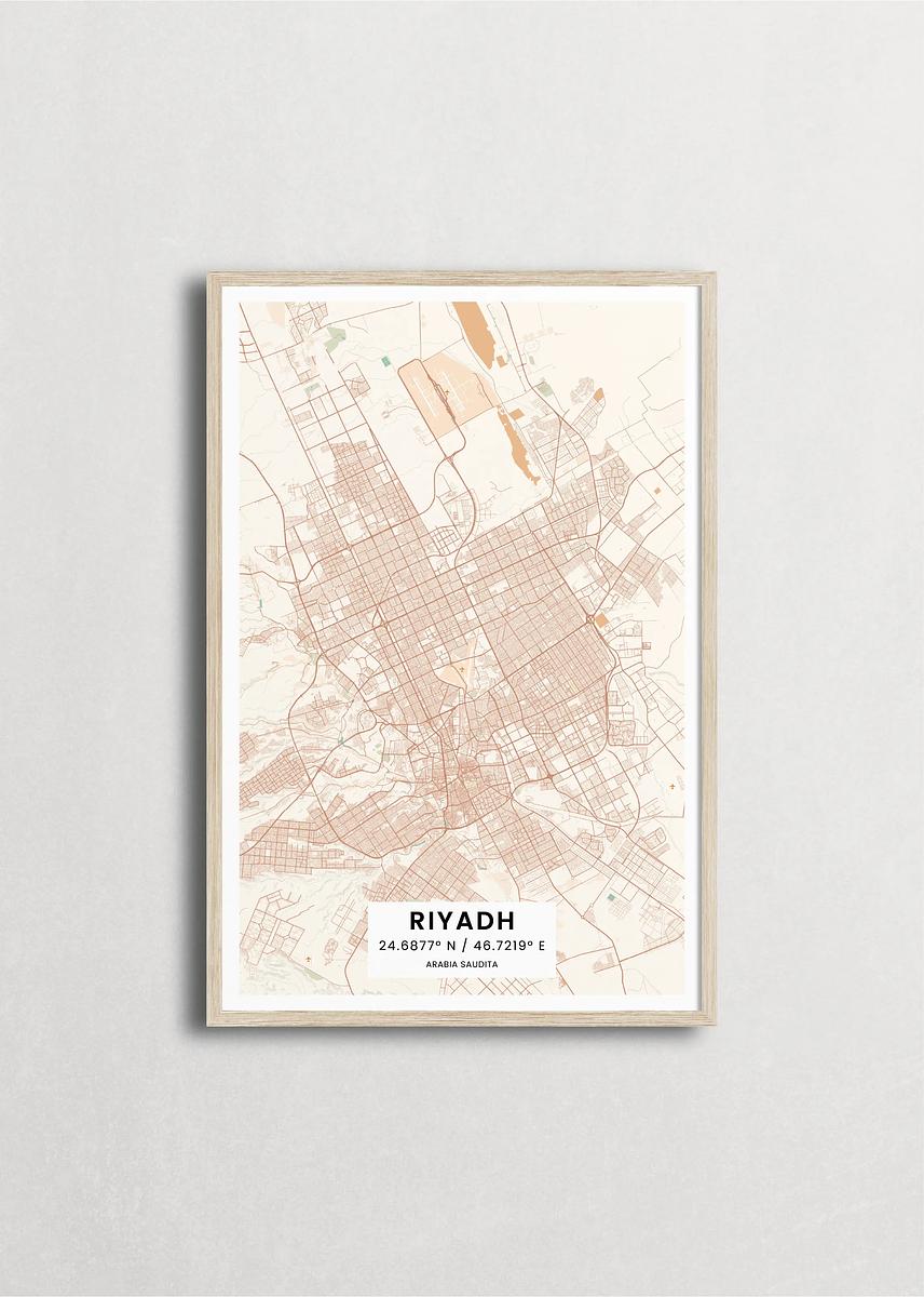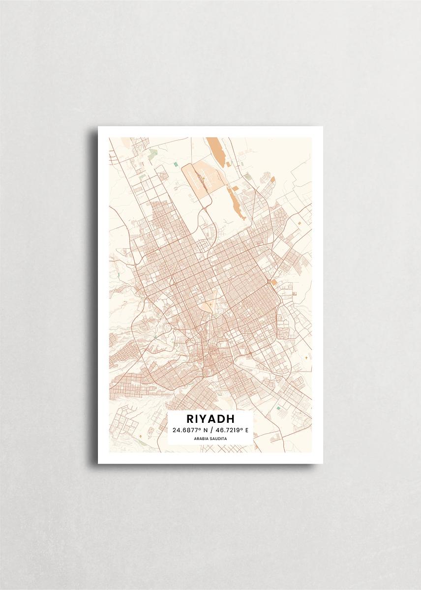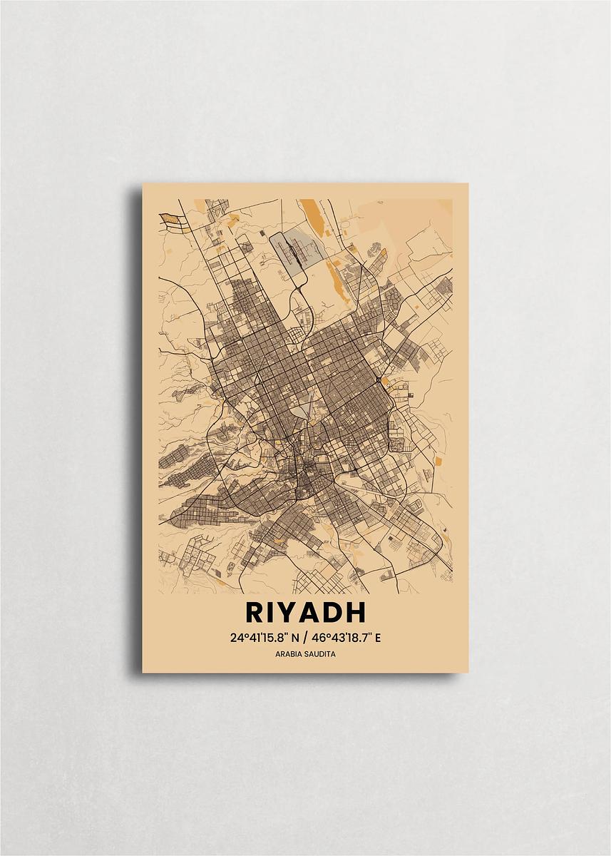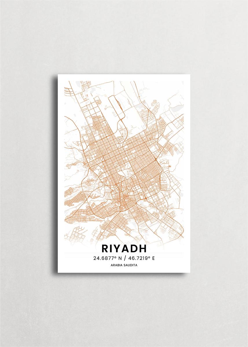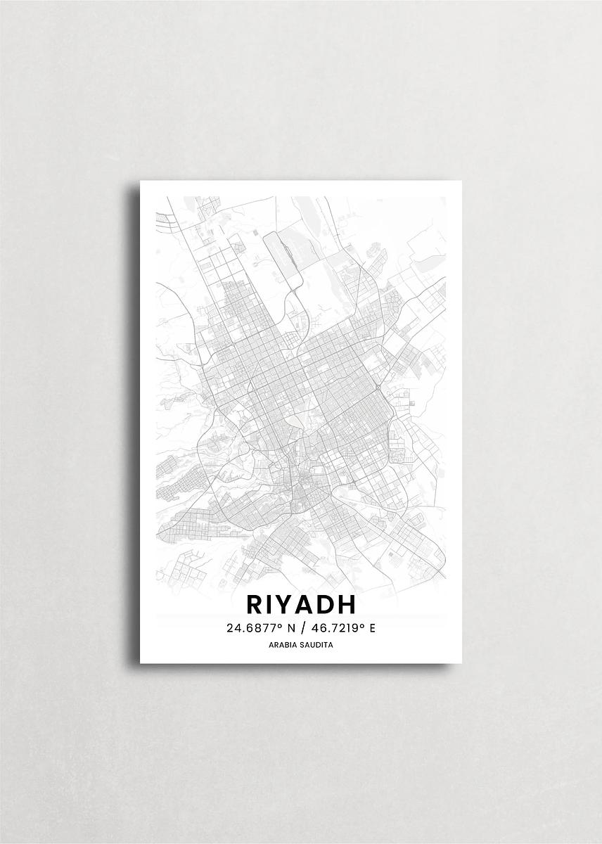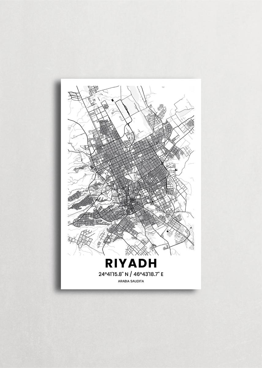 Mapa de la ciudad de Riad diseño minimalista que destaca la forma y la estructura de la ciudad. sus colores crean un contraste llamativo que es atemporal y sofisticado.
