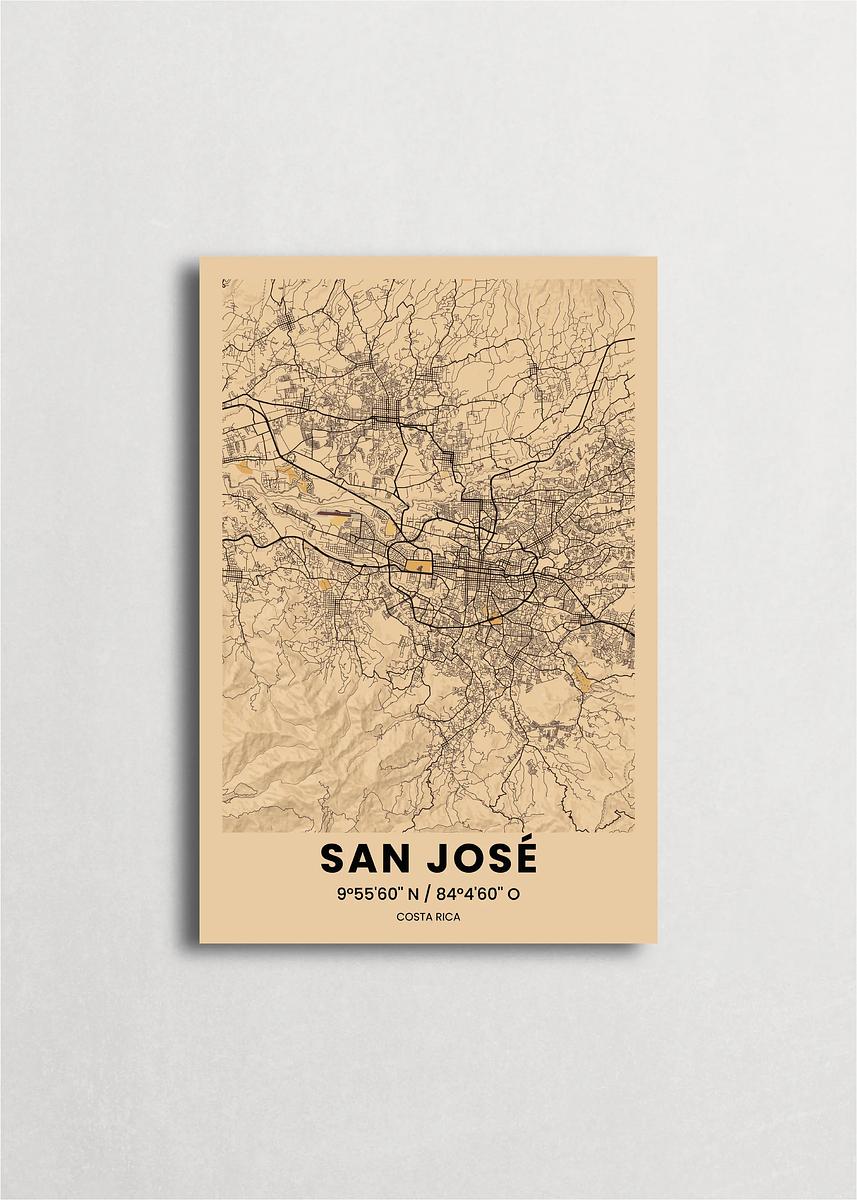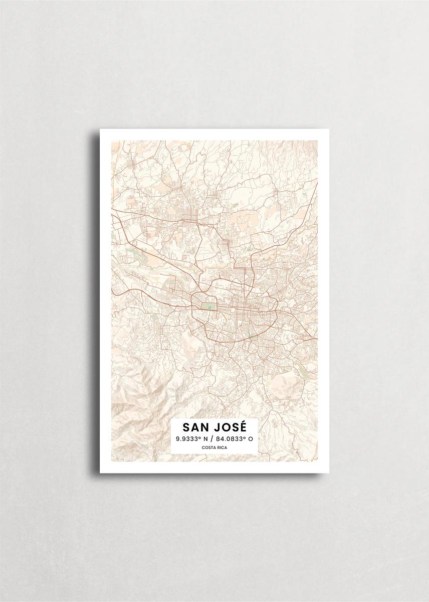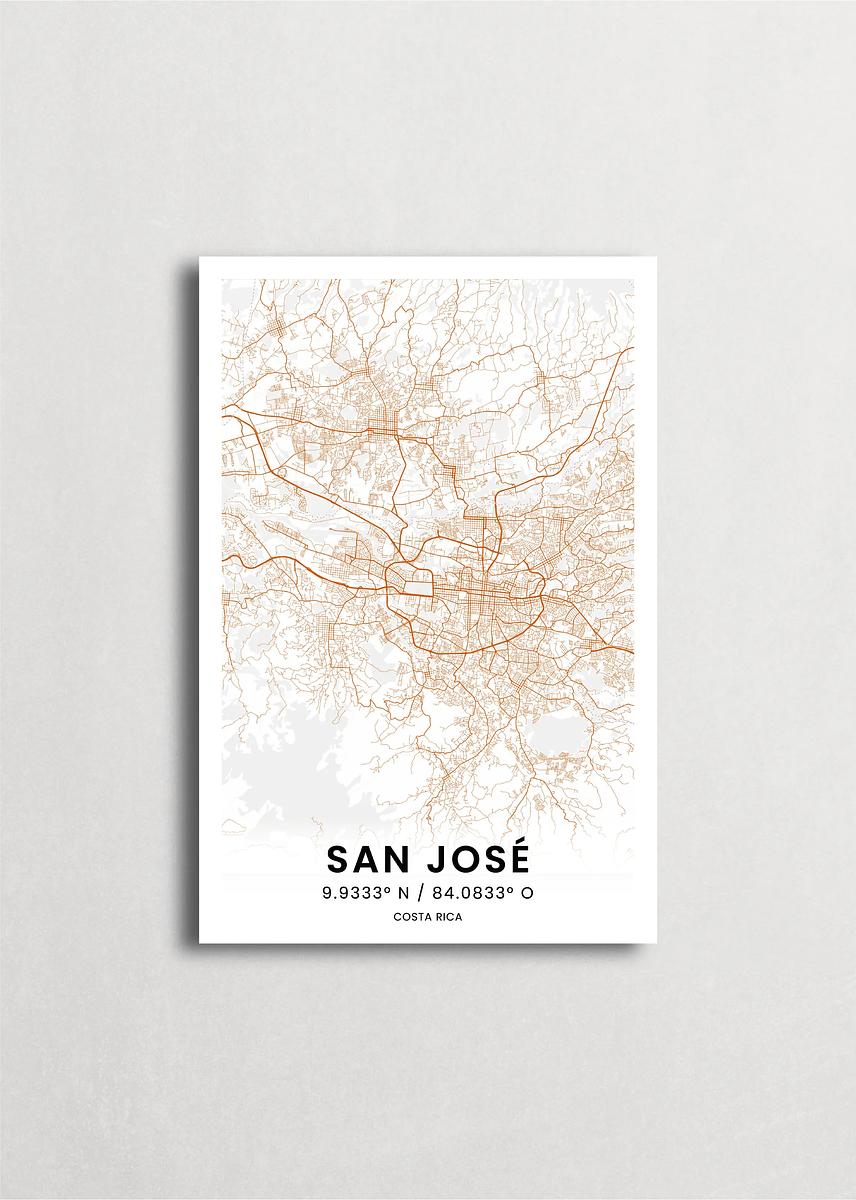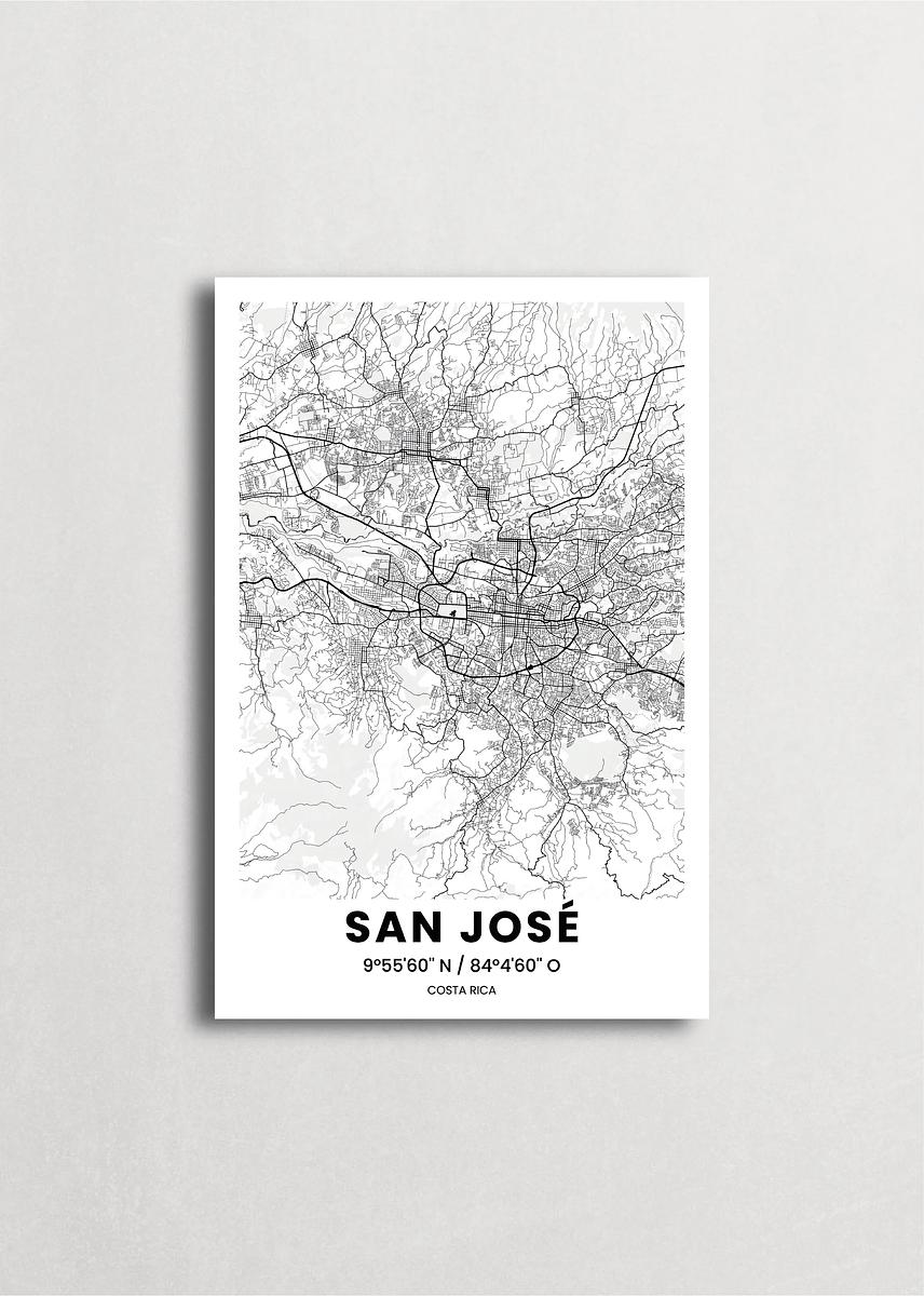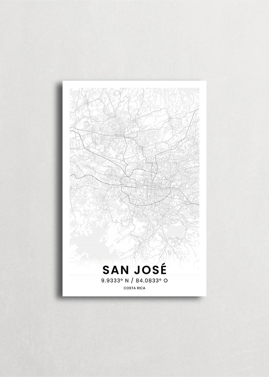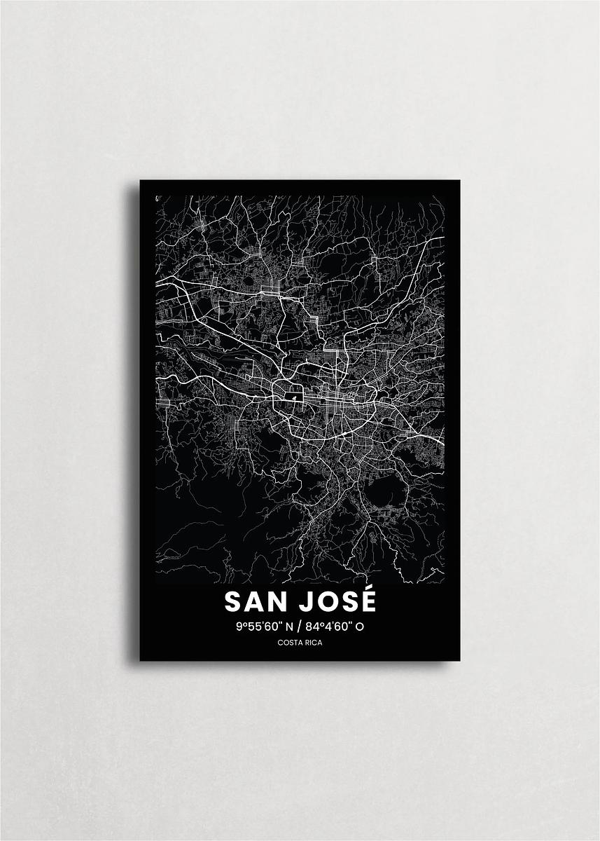 Mapa de la ciudad de San José diseño minimalista que destaca la forma y la estructura de la ciudad. sus colores crean un contraste llamativo que es atemporal y sofisticado.
