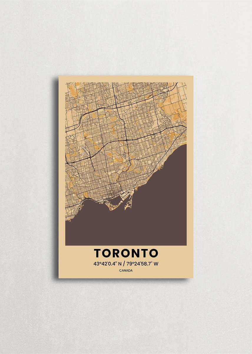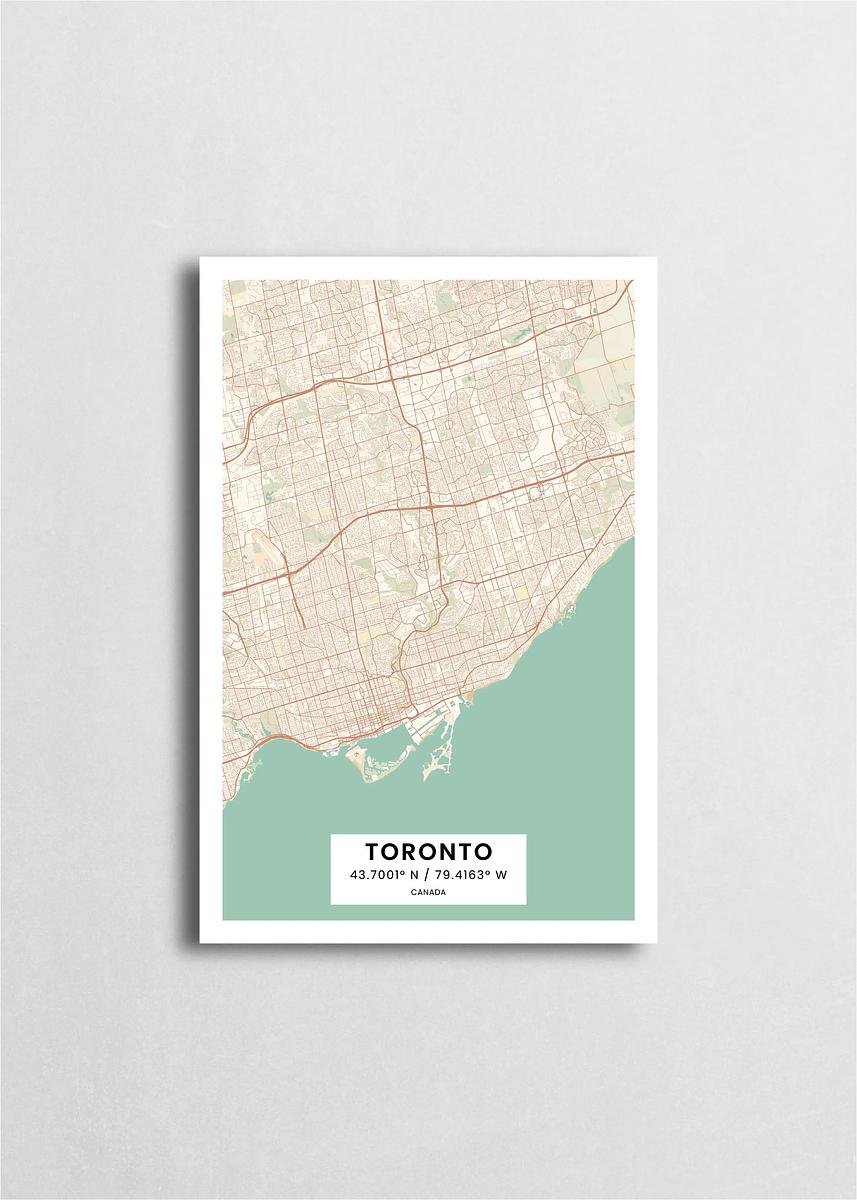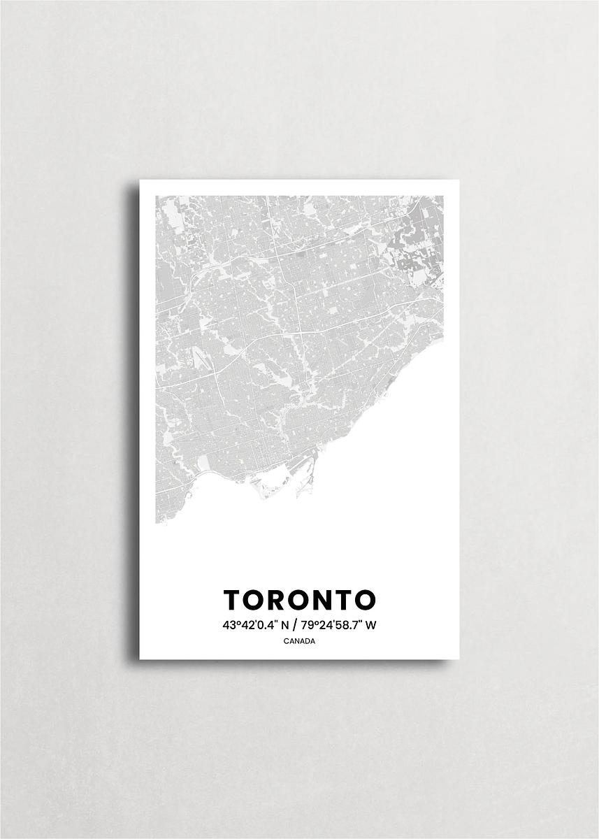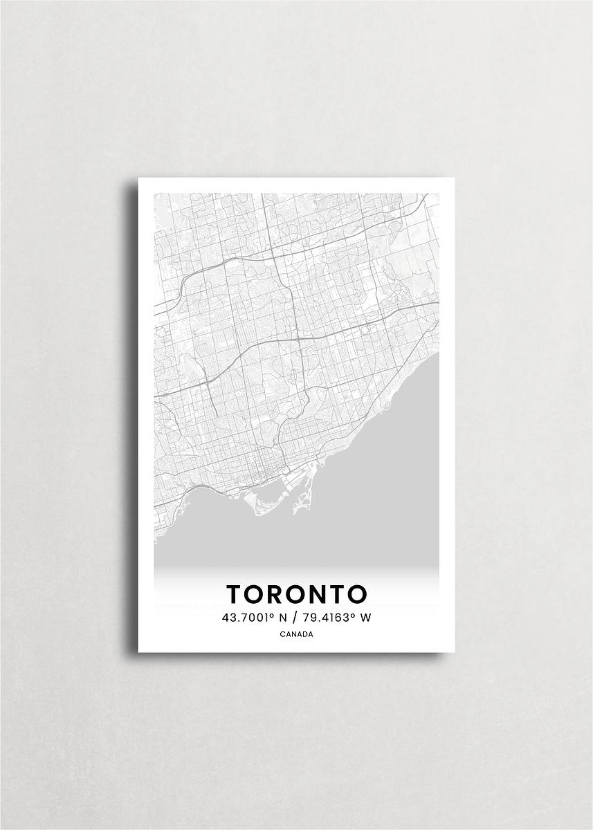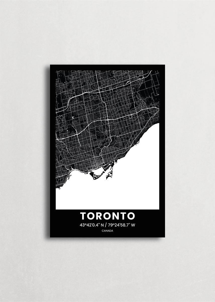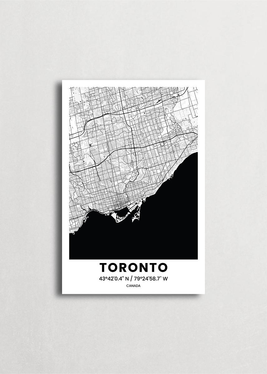 Mapa de la ciudad de Toronto diseño minimalista que destaca la forma y la estructura de la ciudad. sus colores crean un contraste llamativo que es atemporal y sofisticado.