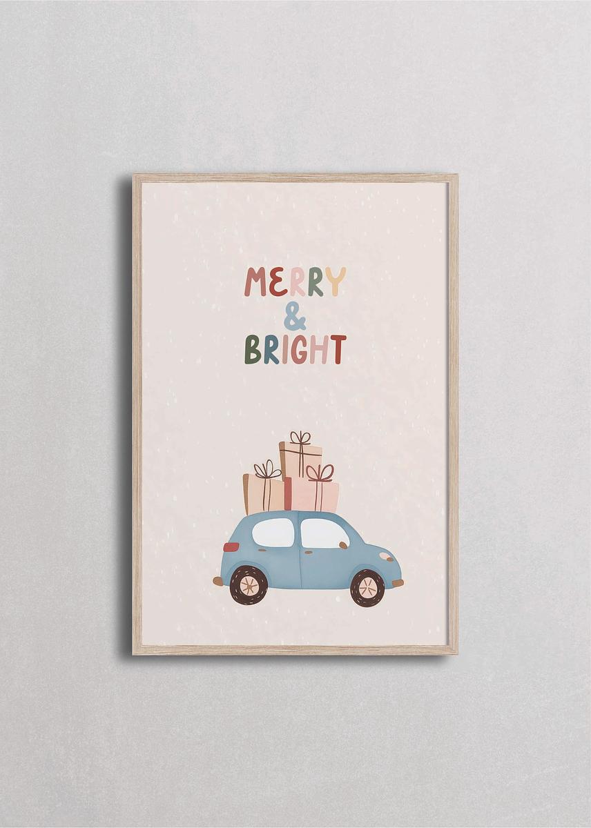 Auto vintage celeste cargando regalos envueltos en tonos pastel con mensaje "Merry & Bright" en letras coloridas. Diseño minimalista sobre fondo blanco perfecto para decoración infantil alegre y moderna. Transmite la emoción y alegría de las fiestas navideñas.