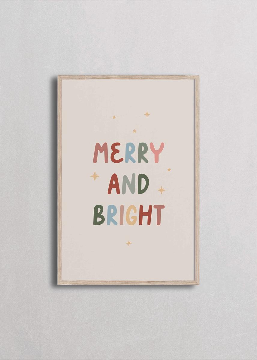 Tipografía multicolor con mensaje "Merry and Bright" en letras juguetonas sobre fondo crema con estrellas doradas dispersas. Esta postal optimista celebra la alegría y luminosidad de la temporada con cada letra en un tono diferente de coral, azul, sage y mostaza. El diseño minimalista y contemporáneo con espacios amplios y aireados la hace perfecta para espacios modernos que buscan positividad, mensajes inspiradores y una Navidad llena de luz, esperanza y esa energía radiante que ilumina los días más oscuros del invierno.