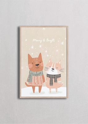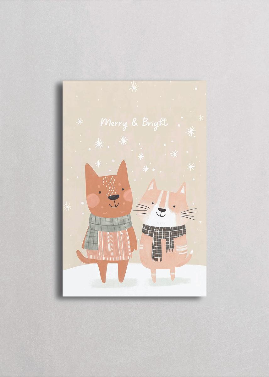 Dulce pareja de mascotas navideñas: un perro naranja y un gato beige con rayas, ambos usando bufandas de cuadros y parados sobre la nieve bajo el mensaje "Merry & Bright". Esta ilustración minimalista con paleta neutra transmite alegría compartida, compañerismo animal y los buenos deseos de la temporada con estilo contemporáneo limpio y encantador.