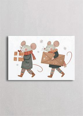 Pareja de ratones gemelos caminando alegremente en la nieve mientras llevan regalos y cartas navideñas, vistiendo bufandas de cuadros y abrigos acogedores. Esta escena captura el espíritu de las compras navideñas y la preparación festiva con tonos tierra cálidos y detalles nostálgicos que evocan tradiciones familiares invernales.