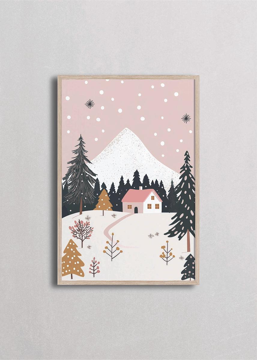 Cabaña rosada solitaria bajo una imponente montaña nevada, rodeada de pinos dorados y negros en un paisaje invernal de ensueño. Esta escena serena invita a desconectar del mundo y refugiarse en la tranquilidad de la naturaleza. Los tonos pastel en rosa y sage contrastan bellamente con los elementos oscuros, creando una composición sofisticada perfecta para amantes de la montaña y los retiros invernales.