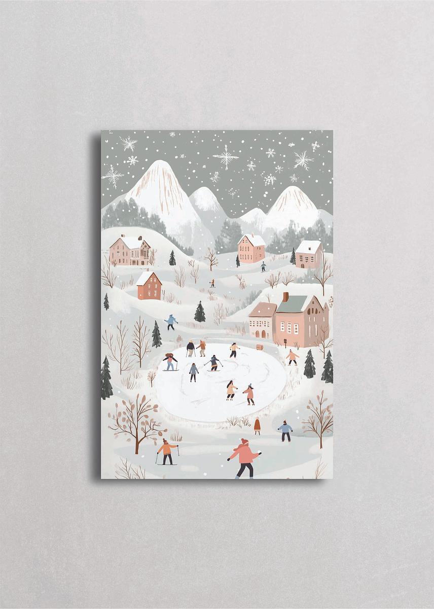 Escena invernal de pueblo en las montañas con casitas en tonos rosa y tierra, personas esquiando y jugando en la nieve. Grandes montañas nevadas de fondo con copos cayendo. Ilustración detallada perfecta para crear una atmósfera acogedora y festiva en habitaciones infantiles.