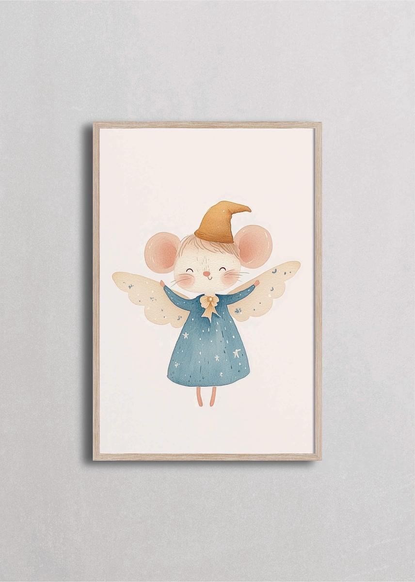 Mágico ratoncito transformado en ángel navideño con alas cremosas decoradas con estrellas, vistiendo un vestido azul celeste con lunares y un gorro dorado puntiagudo. Esta ilustración angelical con fondo limpio transmite inocencia, magia festiva y el espíritu celestial de la navidad con estilo delicado y paleta suave encantadora.