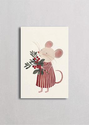 Encantador ratoncito blanco con enormes orejas rosadas abrazando un ramo de acebo navideño, vistiendo un delicado vestido de rayas rojas y blancas. Esta ilustración minimalista con fondo crema captura la ternura y simplicidad de las celebraciones navideñas con un estilo vintage y romántico lleno de dulzura infantil.