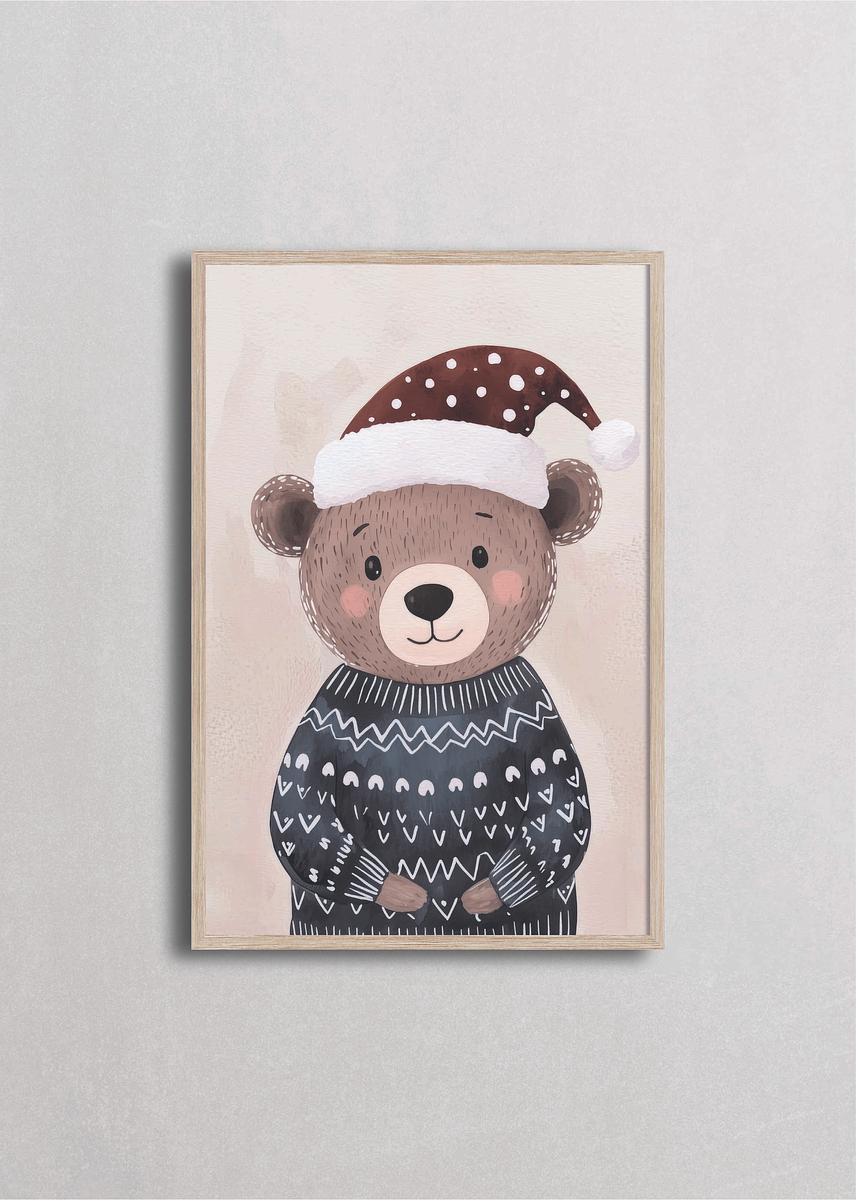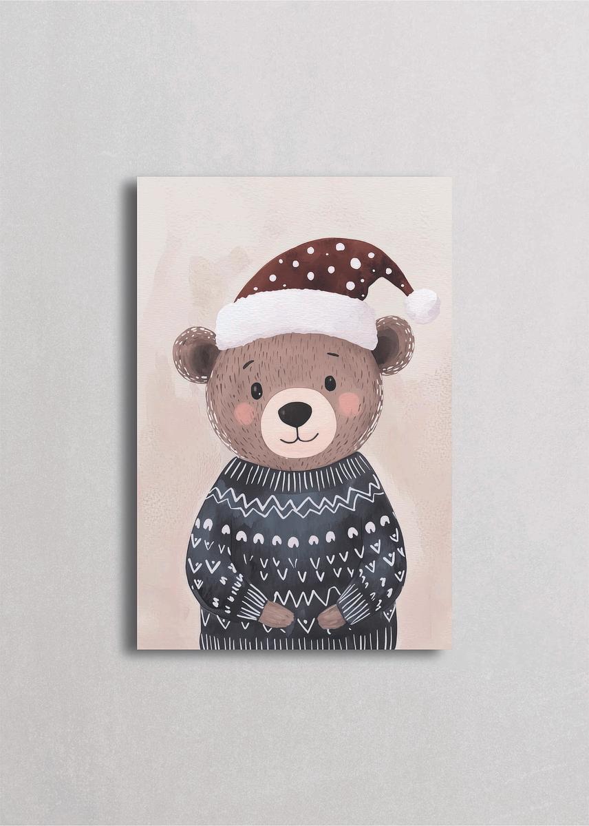 Adorable osito con gorro de Santa café moteado y suéter de patrones nórdicos en gris oscuro sobre fondo neutro. El diseño combina tradición navideña con estética escandinava moderna mediante patrones geométricos y una paleta sofisticada. Perfecto para quienes buscan decoración navideña elegante y contemporánea que se aleje de los colores tradicionales, ideal para espacios modernos y minimalistas.