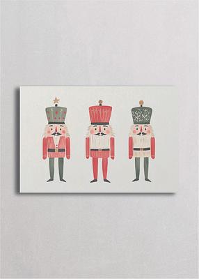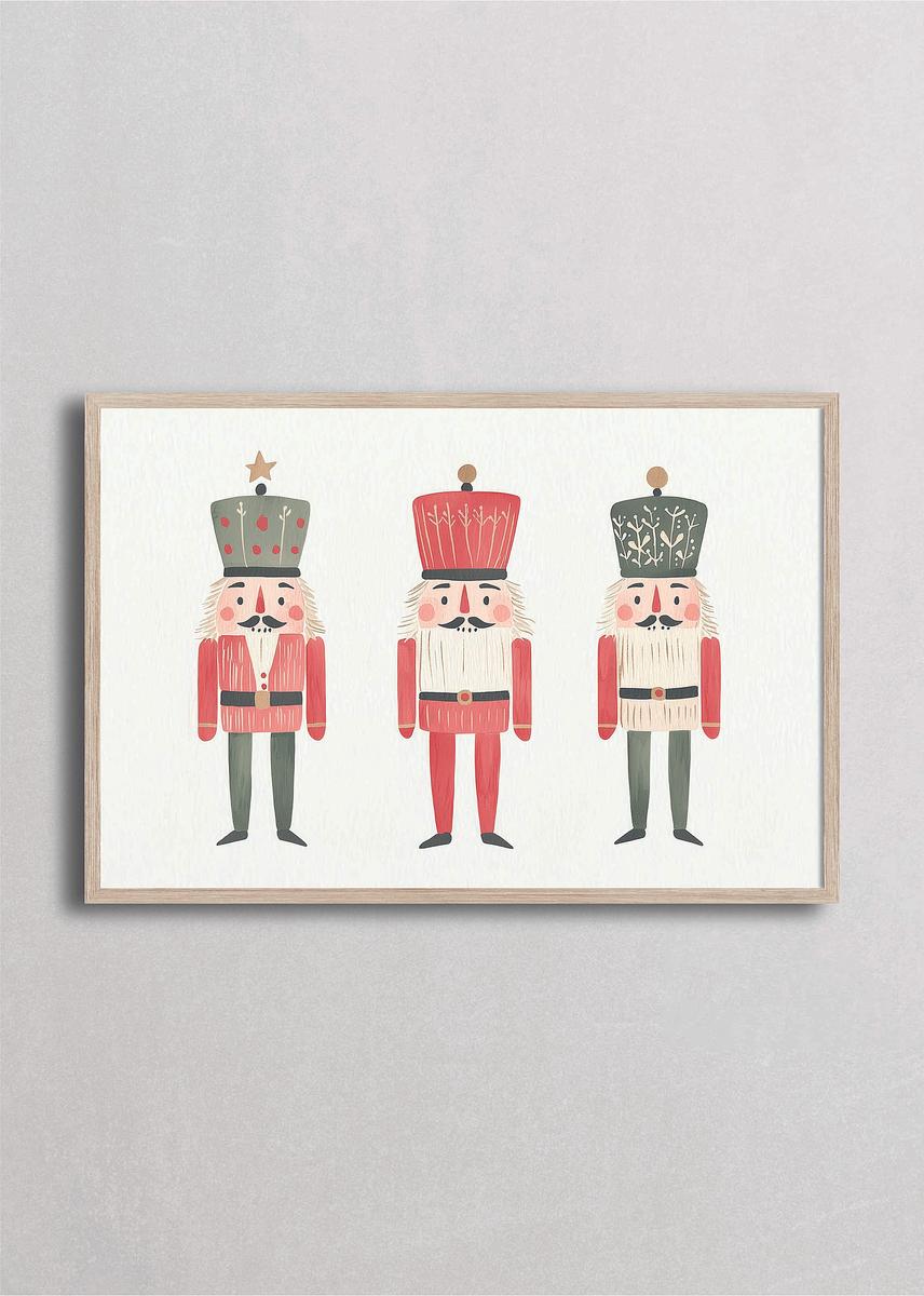 Tres cascanueces vintage en formación con uniformes coral y verde, cada uno con diseño único de sombrero botanical sobre fondo blanco. Esta composición horizontal tipo desfile muestra tres soldaditos con patrones vegetales diferentes en sus sombreros altos, creando una galería de personajes coordinados. Los tonos coral, verde sage y crema con detalles lineales y expresiones uniformes la hacen perfecta para composiciones de galería wall, espacios que valoran la simetría, el diseño repetitivo con variaciones y la elegancia teatral del ballet clásico.