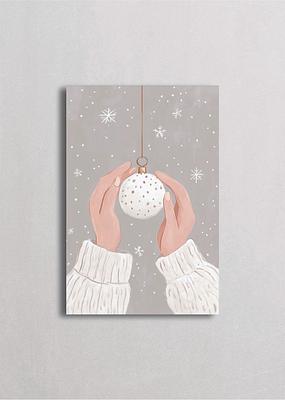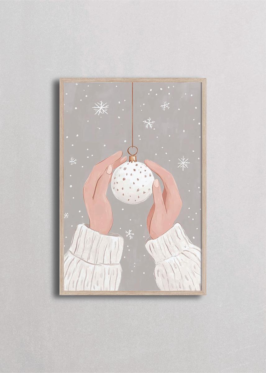 Manos delicadas con suéter blanco sosteniendo una esfera navideña entre copos de nieve cayendo. Esta imagen íntima captura la magia personal de decorar durante las festividades, ese momento tranquilo y especial de preparar el hogar. Los tonos neutros grises y beige con detalles dorados crean una atmósfera de paz y mindfulness navideño, perfecta para espacios minimalistas y conscientes.