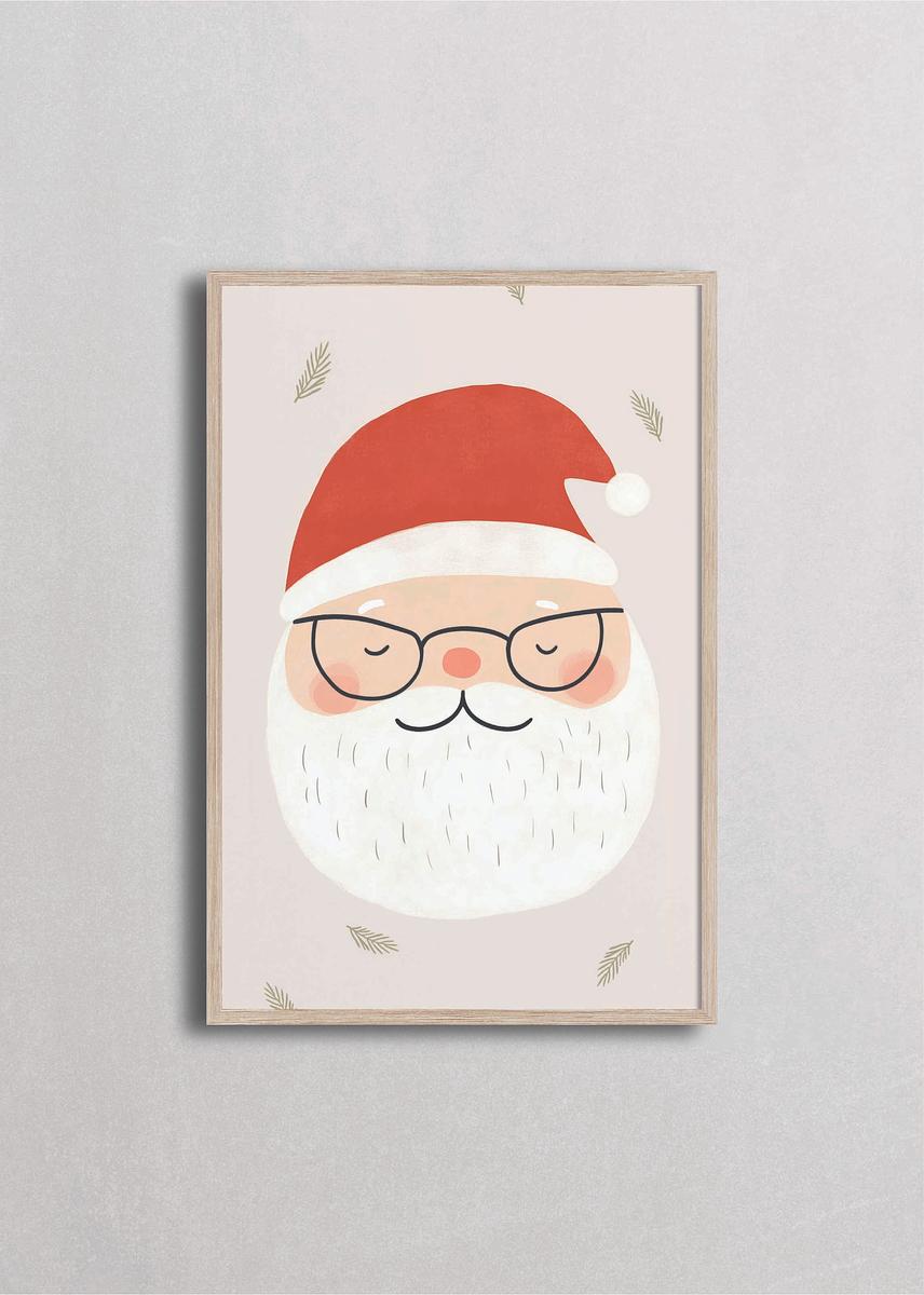 Retrato minimalista de Santa con lentes delgados, ojos cerrados en expresión zen y ramas de pino decorativas sobre fondo crema limpio. Esta ilustración contemporánea y serena presenta a Santa en un momento de paz y reflexión, alejándose del estereotipo siempre alegre. El diseño geométrico simplificado en coral, crema y verde oliva con detalles lineales lo convierte en ideal para espacios modernos que valoran el mindfulness, la simplicidad escandinava y una Navidad más contemplativa y consciente llena de calma interior.