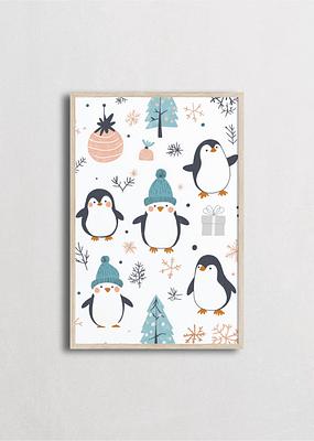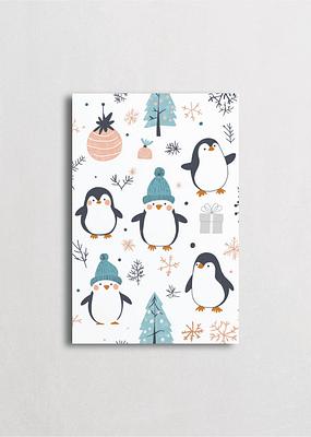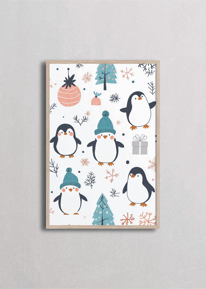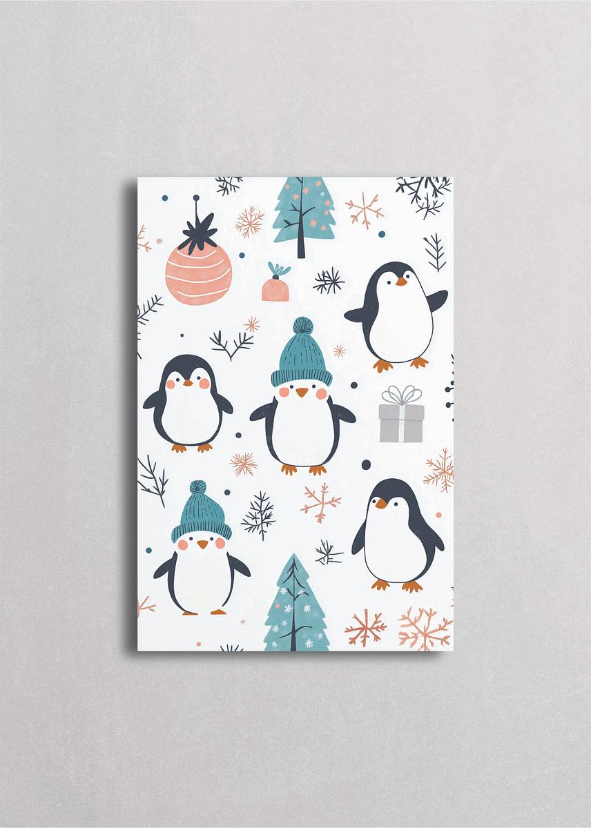 Patrón alegre de pingüinos adorables en diferentes poses festivas, algunos con gorros tejidos azules turquesa, rodeados de árboles navideños, ornamentos y copos de nieve. Esta ilustración repetitiva con fondo blanco limpio celebra la diversión invernal y el espíritu juguetón de las fiestas con estilo escandinavo contemporáneo fresco.