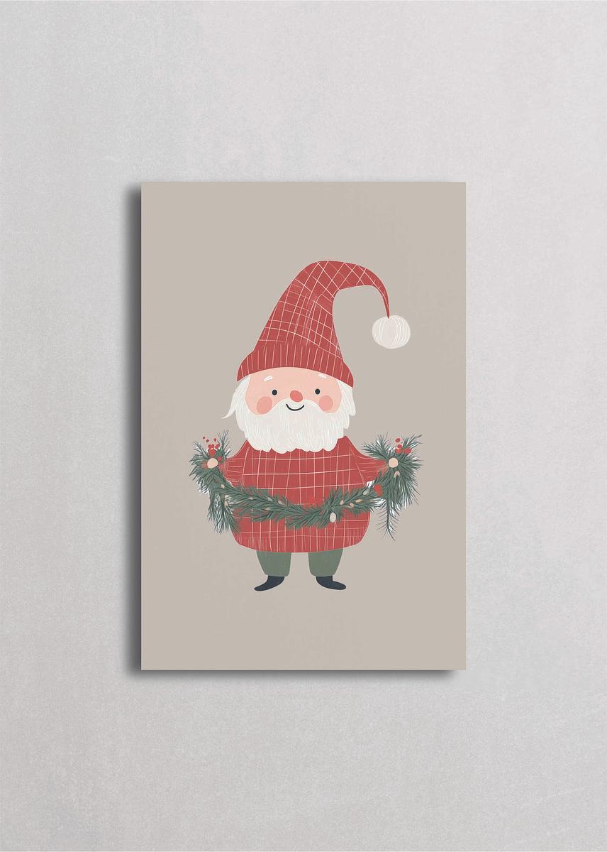 Santa con gorro a cuadros rojos sosteniendo guirnalda de pino fresco decorada con bayas y esferas sobre fondo crema suave. Esta ilustración dulce y minimalista presenta a Santa en un momento de preparación navideña, adornando el hogar con vegetación natural. Los tonos coral apagado, verde oscuro y crema con patrón de cuadros crean una estética cottage moderna perfecta para amantes de la decoración natural, las tradiciones artesanales y una Navidad simple pero significativa.
