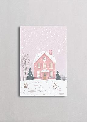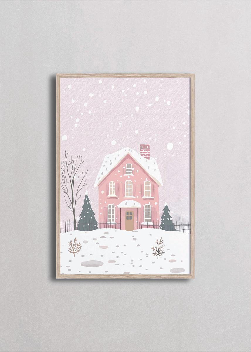 Encantadora casa rosa con techo de tejas rojas rodeada de pinos nevados y cerca decorativa. Intensa nevada crea una escena mágica en tonos pastel rosa y gris. Ilustración dulce y romántica ideal para habitaciones infantiles o espacios con decoración vintage.