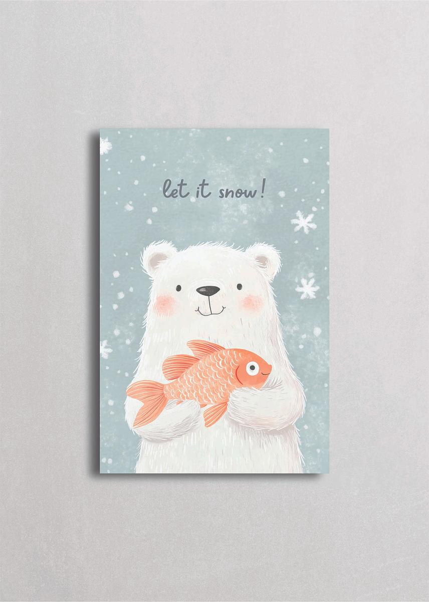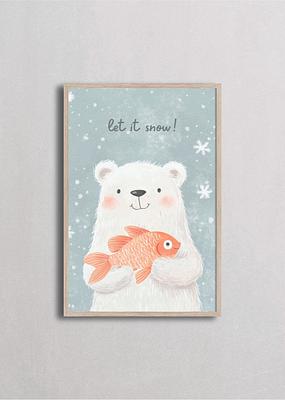 Dulce oso polar sosteniendo con ternura un pez dorado mientras la nieve cae suavemente sobre fondo azul cielo. Esta ilustración captura un momento de amistad inesperada entre especies, transmitiendo calidez y humor. Con su estilo acuarelado suave y mensaje tierno, es ideal para habitaciones infantiles o espacios que celebran la naturaleza y las amistades especiales.