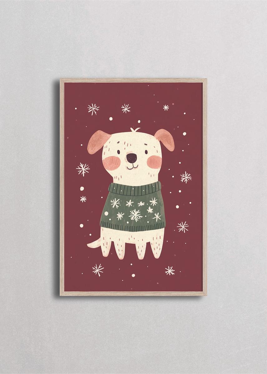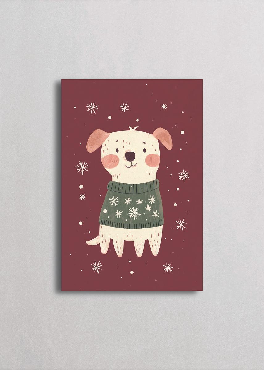 Tierno cachorrito blanco con orejas caídas rosadas vistiendo un suéter verde oliva decorado con copos de nieve navideños sobre un fondo rojo vino elegante. La nieve cayendo alrededor crea una atmósfera festiva cálida y acogedora, perfecta para celebrar la compañía de las mascotas durante las fiestas con estilo vintage encantador.