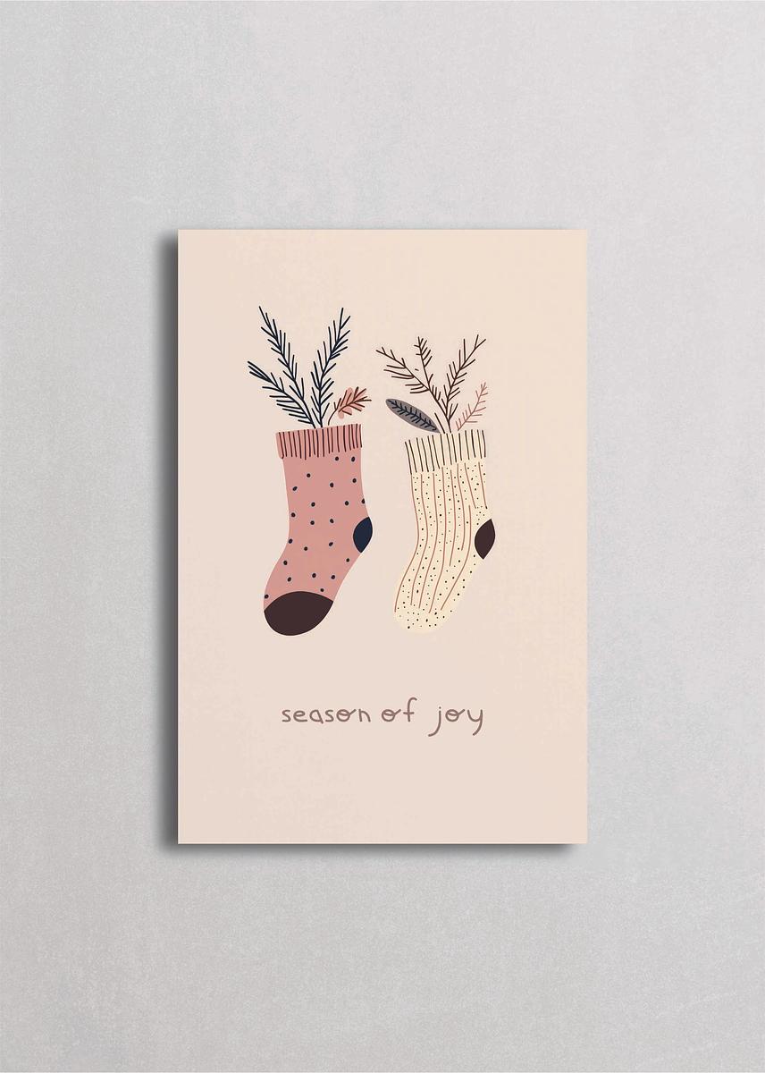 Par de calcetines navideños decorativos en tonos rosa y crema con ramitas de pino saliendo de ellos. Mensaje "season of joy" transmite calidez festiva. Fondo beige minimalista perfecto para decoración navideña sutil y elegante en cualquier espacio del hogar.