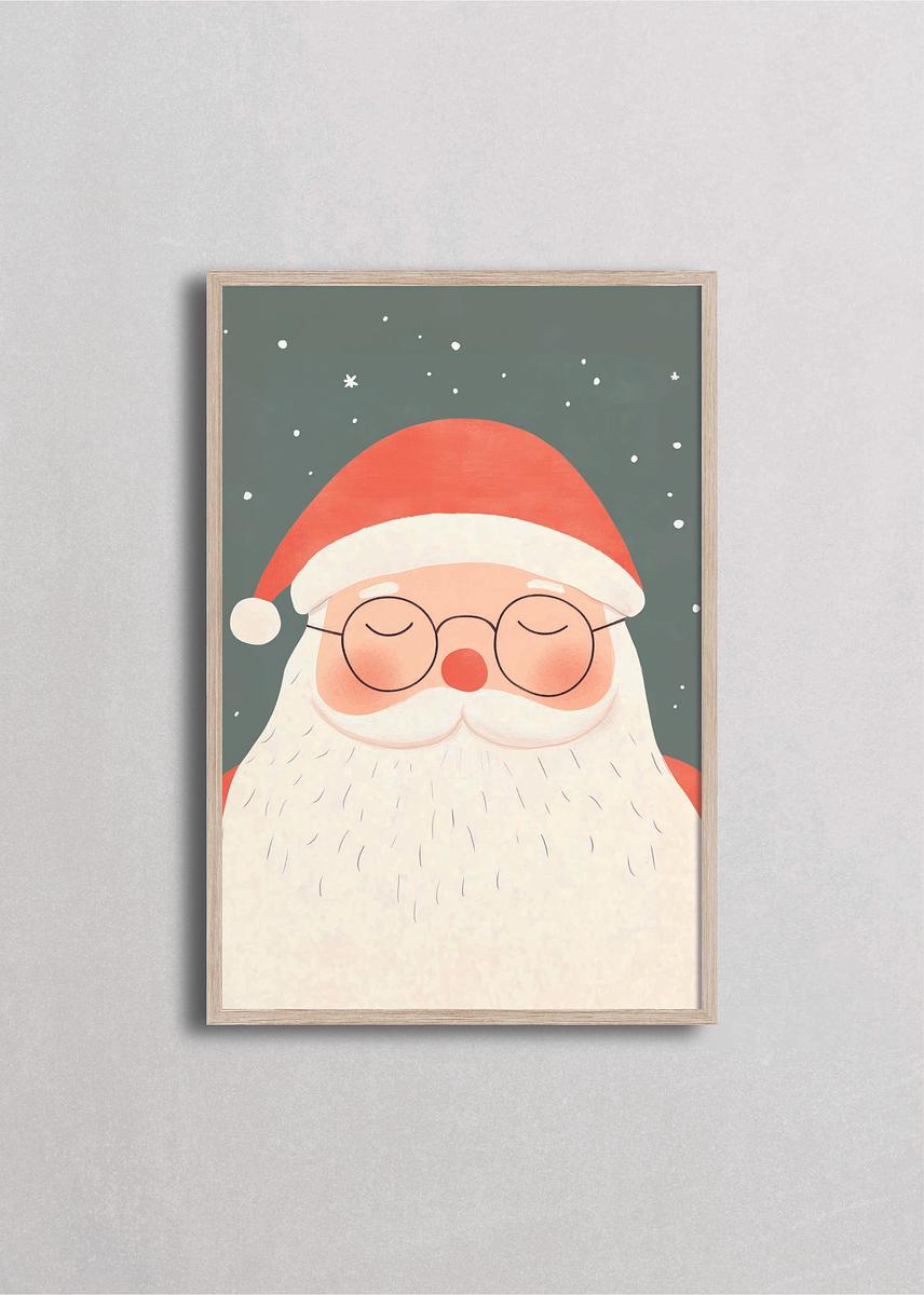 Gran retrato de Santa con lentes redondos y sonrisa gentil sobre fondo sage nevado. Este close-up íntimo muestra a Santa con expresión pacífica y amable, sus ojos cerrados transmitiendo satisfacción y bondad. La composición centrada y los tonos suaves en coral, crema y sage con nieve cayendo crean una atmósfera serena y meditativa, perfecta para espacios que buscan una presencia navideña tranquilizadora, reconfortante y llena de esa sabiduría amable que caracteriza al personaje más querido de las festividades.