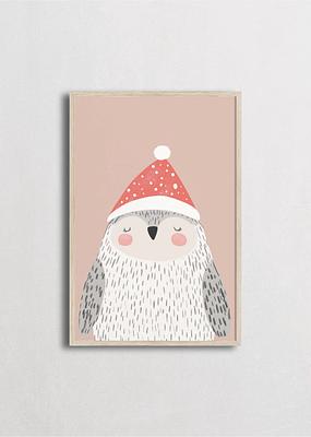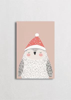 Elegante búho nevado con plumaje blanco texturizado usando un gorro navideño rojo con lunares blancos sobre un fondo rosa empolvado suave. Esta ilustración minimalista captura la serenidad de las aves invernales con un toque festivo dulce, perfecta para decoración navideña con estilo escandinavo moderno y colores pastel delicados.