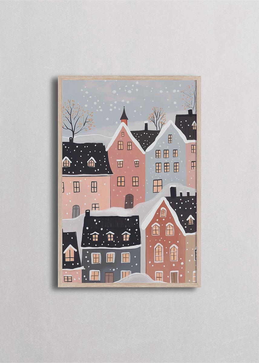 Ciudad europea nevada con tejados cubiertos de nieve, ventanas iluminadas y árboles dorados bajo la tormenta invernal. Este paisaje urbano romántico te transporta a calles empedradas llenas de historia y magia, donde cada ventana cuenta una historia. Perfecta para quienes sueñan con una Navidad cinematográfica en ciudades antiguas, llena de encanto arquitectónico y atmósfera de cuento de hadas.
