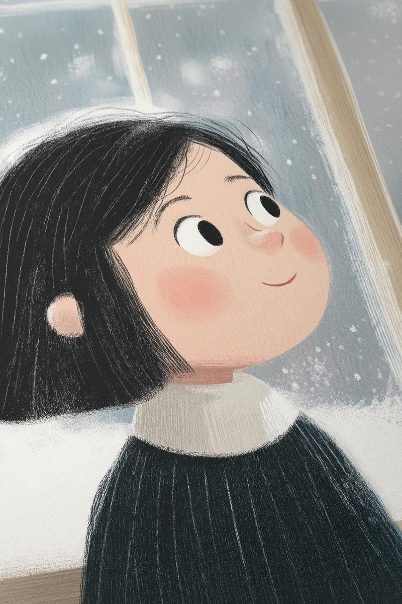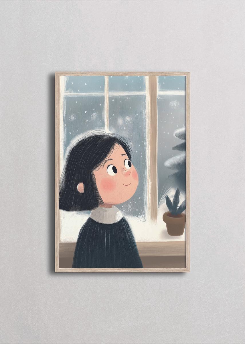 Niña de perfil contemplando la nevada a través de la ventana con expresión soñadora. Esta ilustración íntima y reflexiva captura el momento mágico de observar la primera nevada del invierno desde la calidez del hogar. Los tonos suaves en gris azulado con detalles de luz natural crean una atmósfera contemplativa y serena, ideal para espacios que valoran la quietud, la introspección y esos momentos pausados de asombro infantil ante la naturaleza invernal.