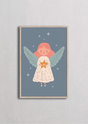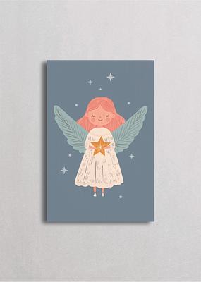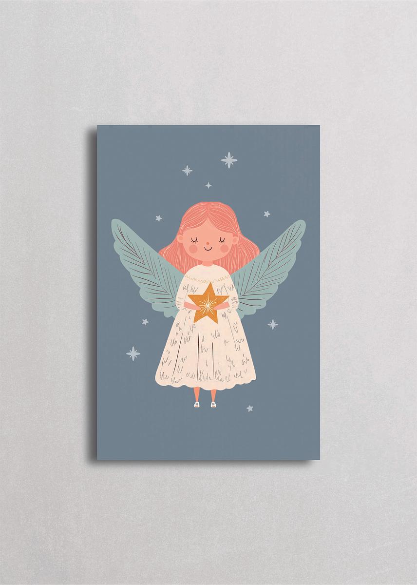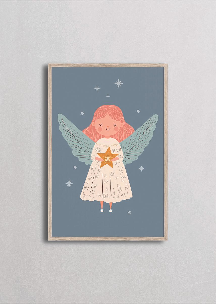 Ángel celestial con alas mint sosteniendo una estrella dorada sobre fondo gris azulado. Esta ilustración tierna captura la inocencia y la magia de los mensajeros navideños, con su expresión serena y colores suaves que transmiten paz. Ideal para habitaciones infantiles o espacios que buscan una decoración navideña angelical, dulce y llena de significado espiritual, recordándonos la luz y esperanza de estas fechas especiales.