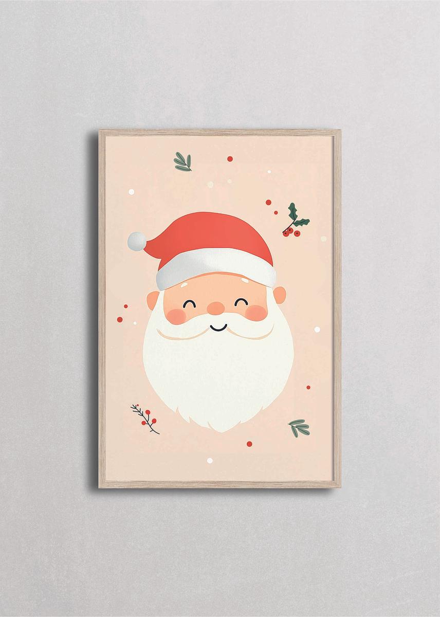 Retrato minimalista de Santa con expresión dulce y sonrisa tierna, rodeado de bayas rojas y ramitas verdes sobre fondo crema. Esta ilustración supersimple captura la bondad de Santa en su forma más pura y accesible, con mejillas rosadas y diseño geométrico limpio. Los tonos coral suave, verde salvia y crema con detalles botanicals dispersos la convierten en perfecta para espacios que buscan una Navidad gentil, acogedora y llena de esa calidez reconfortante que nos hace sentir en casa.