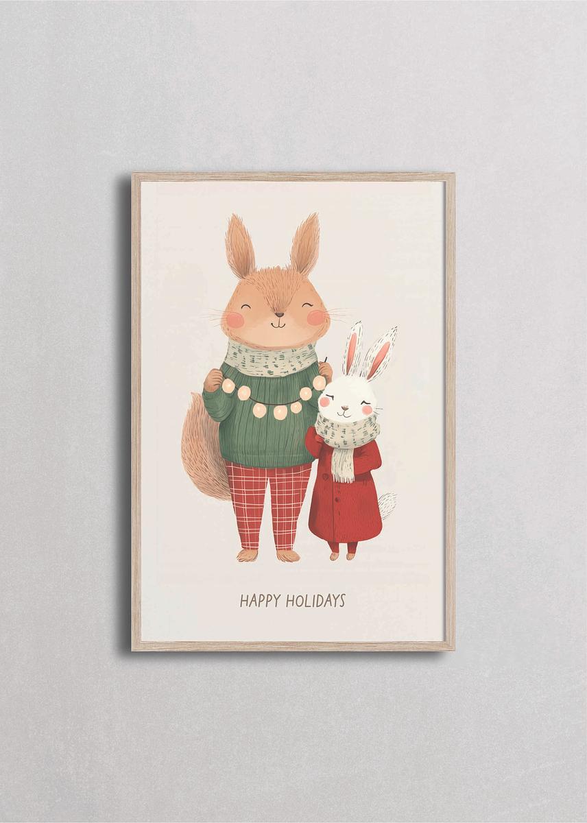 Tierna ilustración de un conejito padre e hijo vestidos con suéteres festivos y bufandas, celebrando juntos las fiestas. Los detalles como el suéter verde con pompones y los pantalones a cuadros crean una atmósfera cálida y familiar, ideal para espacios donde se reúne la familia durante la temporada navideña.