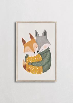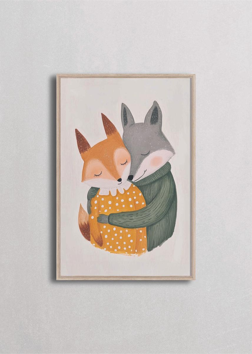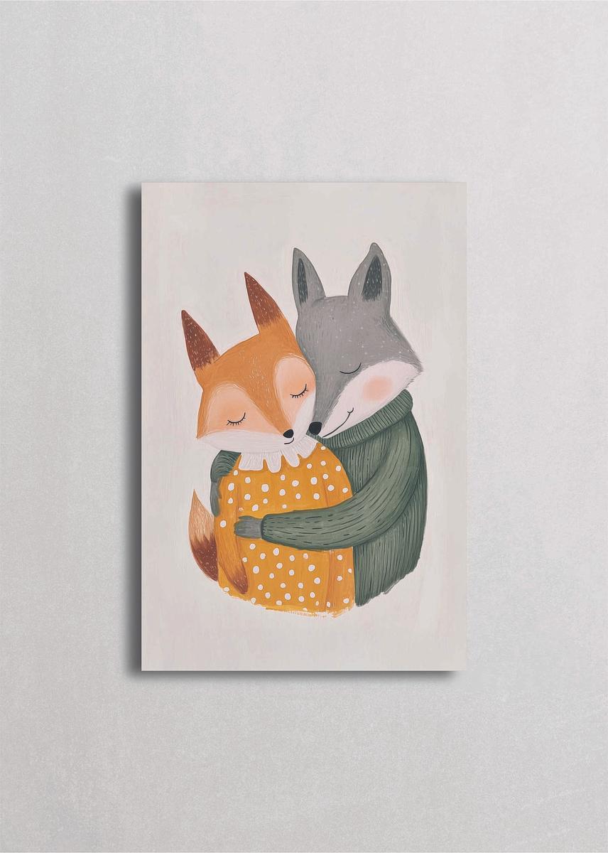 Tierna escena de dos zorros enamorados abrazándose en la nieve, uno en tono dorado y otro gris, vistiendo suéteres tejidos con lunares. Esta ilustración irradia amor, calidez y compañía, perfecta para celebrar la conexión especial de la temporada invernal con estilo minimalista y colores suaves.