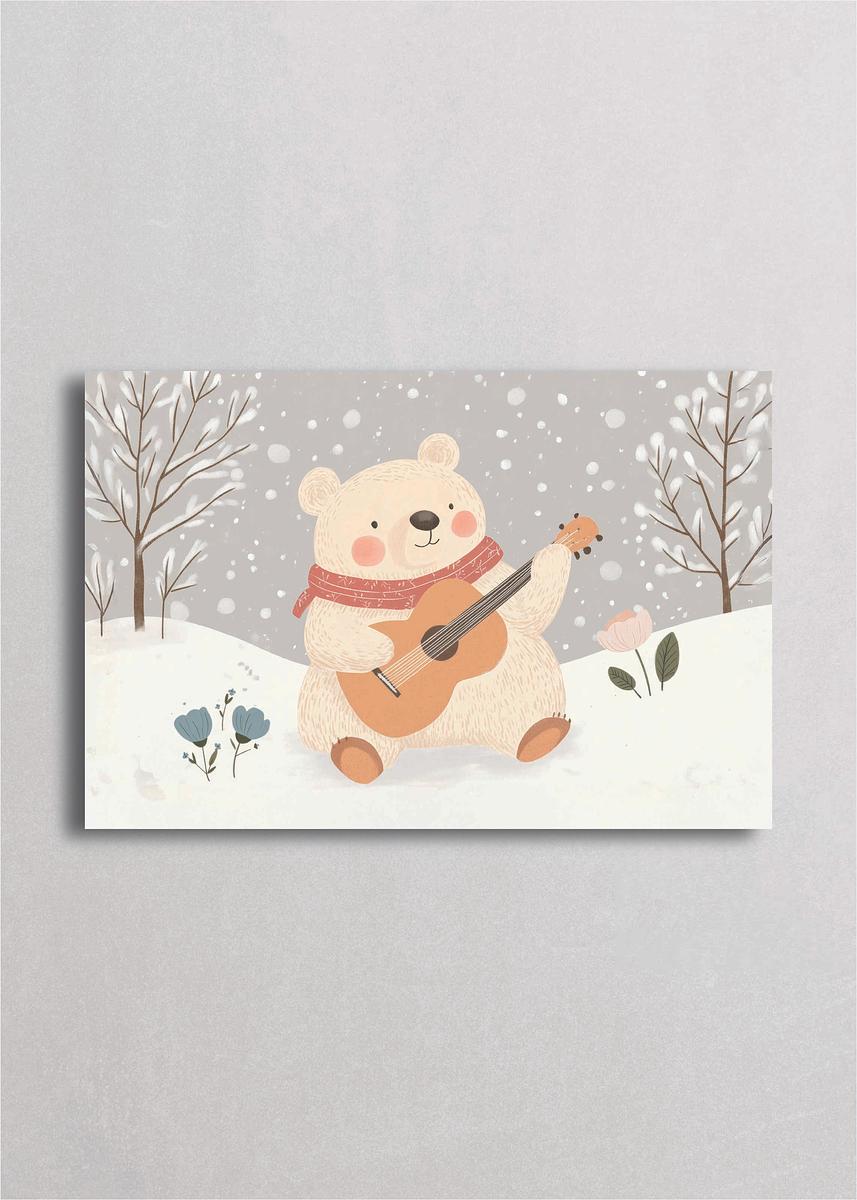Oso polar tocando guitarra en un paisaje nevado con árboles desnudos y flores invernales. La bufanda coral y el pequeño pájaro acompañante añaden toques de color a la escena invernal serena. Esta ilustración combina música, naturaleza y la temporada fría, ideal para amantes de la música que buscan decoración invernal con alma artística y pacífica.