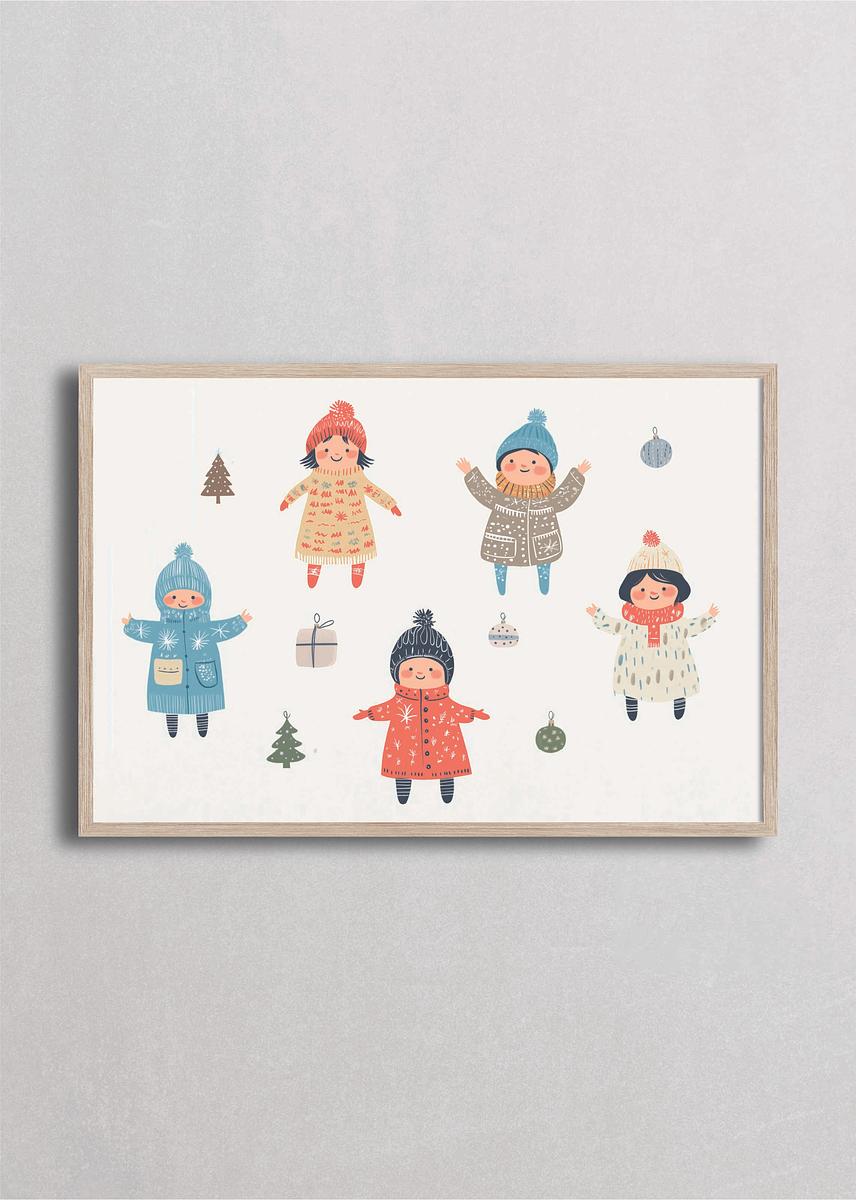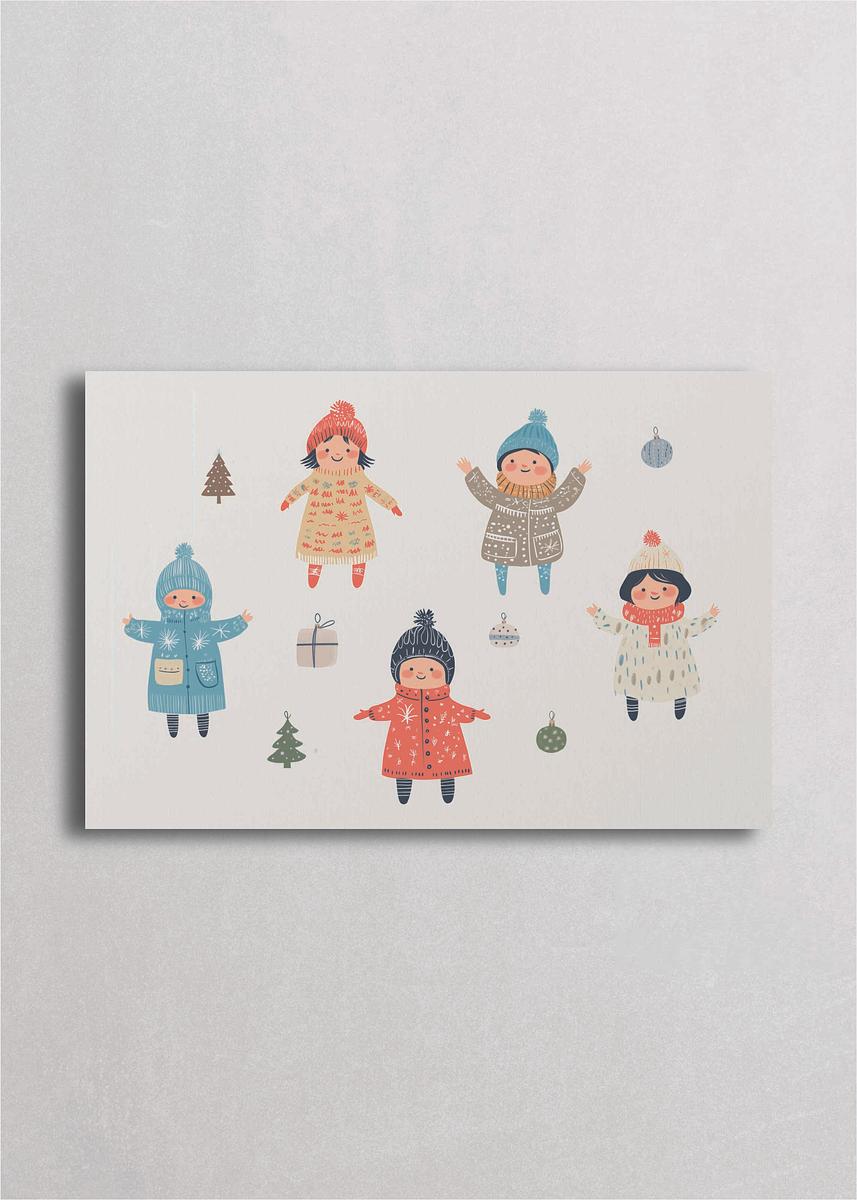Colección de cinco niños festivos con abrigos coloridos y gorros pompón celebrando la Navidad. Esta composición alegre y diversa muestra diferentes personalidades infantiles disfrutando la temporada con brazos abiertos y sonrisas radiantes. Los detalles de ropa tejida, las bufandas y los patrones únicos de cada atuendo crean una escena vibrante perfecta para espacios infantiles, guarderías o áreas familiares que celebran la diversidad y la alegría compartida.