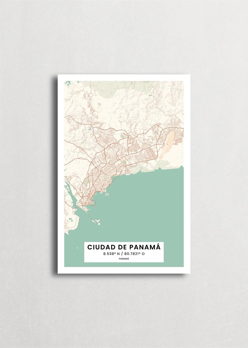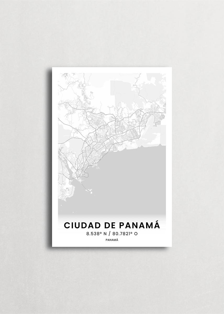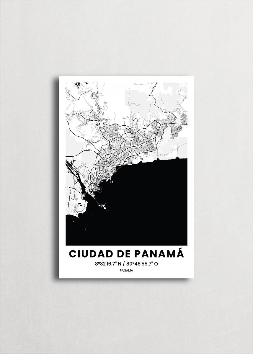 Mapa de Ciudad de Panamá diseño minimalista que destaca la forma y la estructura de la ciudad. sus colores crean un contraste llamativo que es atemporal y sofisticado.